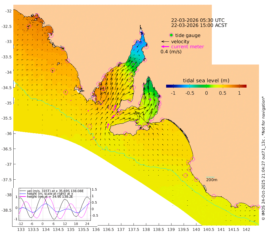 0cm/s 3T +10cm/s rms + 5cm/s 114T. SAM1DS 520m 7cm/s 34T +13cm/s rms + 5cm/s -36T. SAM2CP 100m 7cm/s 29T +21cm/s rms + 18cm/s 142T. SAM3MS 168m 2cm/s -43T +22cm/s rms + 0cm/s -30T. SAM4CY 117m 3cm/s -68T +23cm/s rms + 2cm/s 99T. SAM5CB 94m 24cm/s 49T +8cm/s rms + 3cm/s -172T. SAM6IS 83m 4cm/s 43T +11cm/s rms + 7cm/s 150T. SAM7DS 519m 31cm/s 24T +10cm/s rms + 2cm/s 87T. SAM8SG 47m 26cm/s 14T +20cm/s rms + 12cm/s -168T. NRSKAI 101m 40cm Warrnambool 38cm Port Fairy 40cm Portland 43cm Port Macdonnell 40cm Beachport 43cm Cape Rabelais (off) 44cm Robe 45cm Cape Jaffa 46cm Kingston 47cm Victor Harbor 43cm Vivonne Bay 28cm Kingscote 22cm American River 41cm Penneshaw 22cm Cape Jervis 11cm Second Valley 14cm Port Noarlunga 14cm Port Stanvac 9cm Brighton 14cm Glenelg 6cm Port Adelaide (Outer Harbor) -28cm Angus Inlet (Garden Island) 8cm Ardrossan 32cm Port Vincent 33cm Port Giles 54cm Stenhouse Bay 50cm Althorpe Island 47cm Pondalowie Bay 55cm Point Turton 51cm Port Victoria 43cm Cape Elizabeth 38cm Tiparra Reef Light 8cm Wallaroo 3cm Middle Bank -30cm Port Broughton -92cm Port Pirie -117cm Red Cliff Point (Beacon 5) -76cm Port Bonython -72cm Whyalla -57cm Western Shoal Beacon 12cm Franklin Harbor 52cm Franklin Harbor Entrance Beacon 65cm Arno Bay 80cm Port Neill 73cm Cape Hardy 76cm Tumby Bay 72cm Reevesby Island 78cm Port Lincoln 66cm Taylors Landing 55cm Whalers Bay 56cm Wedge Island Mooring 45cm Shelf Edge Mooring 61cm Coffin Bay Entrance Beacon 49cm Greenly Island 61cm Elliston 57cm Pearson Island 52cm Venus Bay 88cm Blanche Port (Streaky Bay) 85cm Thevenard 68cm St Francis Island