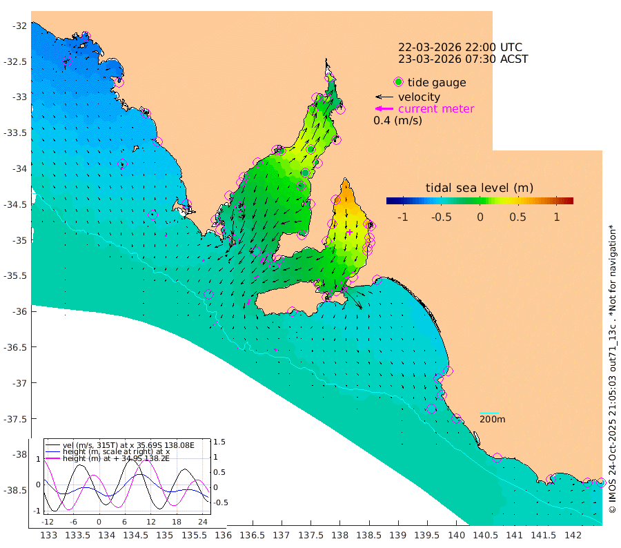 1cm/s 109T +10cm/s rms + 5cm/s 114T. SAM1DS 520m 5cm/s -128T +13cm/s rms + 5cm/s -36T. SAM2CP 100m 1cm/s -44T +21cm/s rms + 18cm/s 142T. SAM3MS 168m 6cm/s 115T +22cm/s rms + 0cm/s -30T. SAM4CY 117m 4cm/s 166T +23cm/s rms + 2cm/s 99T. SAM5CB 94m 10cm/s -126T +8cm/s rms + 3cm/s -172T. SAM6IS 83m 1cm/s -44T +11cm/s rms + 7cm/s 150T. SAM7DS 519m 12cm/s -151T +10cm/s rms + 2cm/s 87T. SAM8SG 47m 12cm/s -165T +20cm/s rms + 12cm/s -168T. NRSKAI 101m -50cm Warrnambool -47cm Port Fairy -47cm Portland -46cm Port Macdonnell -43cm Beachport -46cm Cape Rabelais (off) -47cm Robe -49cm Cape Jaffa -50cm Kingston -44cm Victor Harbor -42cm Vivonne Bay 13cm Kingscote 8cm American River -6cm Penneshaw 7cm Cape Jervis 27cm Second Valley 44cm Port Noarlunga 47cm Port Stanvac 52cm Brighton 52cm Glenelg 63cm Port Adelaide (Outer Harbor) 74cm Angus Inlet (Garden Island) 81cm Ardrossan 52cm Port Vincent 38cm Port Giles -29cm Stenhouse Bay -33cm Althorpe Island -32cm Pondalowie Bay -26cm Point Turton -21cm Port Victoria -16cm Cape Elizabeth -21cm Tiparra Reef Light -9cm Wallaroo -2cm Middle Bank -22cm Port Broughton 4cm Port Pirie 19cm Red Cliff Point (Beacon 5) 16cm Port Bonython 16cm Whyalla 10cm Western Shoal Beacon 2cm Franklin Harbor -11cm Franklin Harbor Entrance Beacon -20cm Arno Bay -29cm Port Neill -31cm Cape Hardy -35cm Tumby Bay -37cm Reevesby Island -42cm Port Lincoln -43cm Taylors Landing -28cm Whalers Bay -38cm Wedge Island Mooring -42cm Shelf Edge Mooring -54cm Coffin Bay Entrance Beacon -45cm Greenly Island -54cm Elliston -51cm Pearson Island -46cm Venus Bay -75cm Blanche Port (Streaky Bay) -73cm Thevenard -68cm St Francis Island
