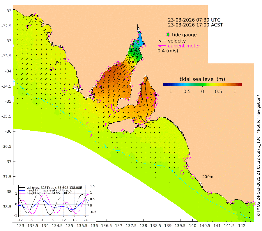 0cm/s -19T +10cm/s rms + 5cm/s 114T. SAM1DS 520m 4cm/s -78T +13cm/s rms + 5cm/s -36T. SAM2CP 100m 7cm/s -16T +21cm/s rms + 18cm/s 142T. SAM3MS 168m 5cm/s -58T +22cm/s rms + 0cm/s -30T. SAM4CY 117m 5cm/s -128T +23cm/s rms + 2cm/s 99T. SAM5CB 94m 14cm/s 43T +8cm/s rms + 3cm/s -172T. SAM6IS 83m 3cm/s 9T +11cm/s rms + 7cm/s 150T. SAM7DS 519m 24cm/s 4T +10cm/s rms + 2cm/s 87T. SAM8SG 47m 19cm/s 10T +20cm/s rms + 12cm/s -168T. NRSKAI 101m 22cm Warrnambool 21cm Port Fairy 23cm Portland 27cm Port Macdonnell 24cm Beachport 25cm Cape Rabelais (off) 26cm Robe 28cm Cape Jaffa 27cm Kingston 33cm Victor Harbor 23cm Vivonne Bay 73cm Kingscote 63cm American River 68cm Penneshaw 60cm Cape Jervis 71cm Second Valley 89cm Port Noarlunga 94cm Port Stanvac 93cm Brighton 98cm Glenelg 102cm Port Adelaide (Outer Harbor) 76cm Angus Inlet (Garden Island) 123cm Ardrossan 118cm Port Vincent 105cm Port Giles 54cm Stenhouse Bay 52cm Althorpe Island 44cm Pondalowie Bay 71cm Point Turton 70cm Port Victoria 69cm Cape Elizabeth 69cm Tiparra Reef Light 52cm Wallaroo 55cm Middle Bank -12cm Port Broughton -26cm Port Pirie -37cm Red Cliff Point (Beacon 5) -5cm Port Bonython 5cm Whyalla 15cm Western Shoal Beacon 63cm Franklin Harbor 89cm Franklin Harbor Entrance Beacon 89cm Arno Bay 98cm Port Neill 85cm Cape Hardy 81cm Tumby Bay 74cm Reevesby Island 71cm Port Lincoln 53cm Taylors Landing 64cm Whalers Bay 51cm Wedge Island Mooring 28cm Shelf Edge Mooring 36cm Coffin Bay Entrance Beacon 26cm Greenly Island 34cm Elliston 27cm Pearson Island 34cm Venus Bay 45cm Blanche Port (Streaky Bay) 41cm Thevenard 26cm St Francis Island