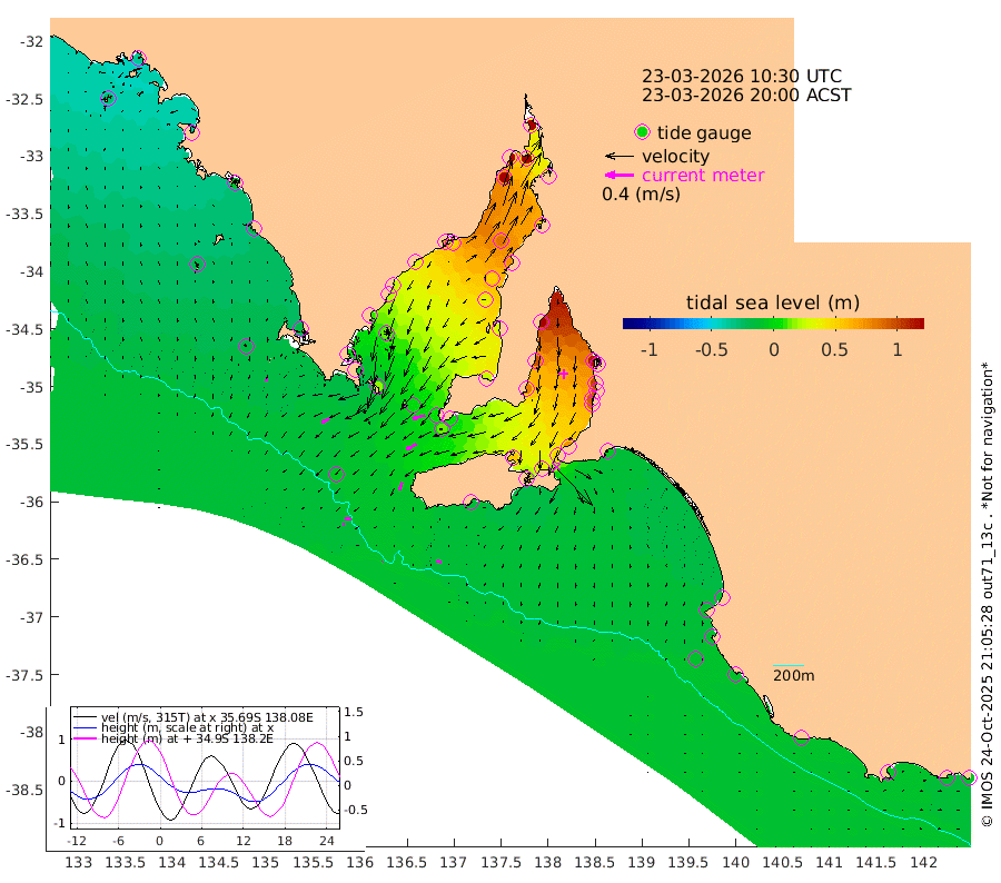 1cm/s -151T +10cm/s rms + 5cm/s 114T. SAM1DS 520m 12cm/s -118T +13cm/s rms + 5cm/s -36T. SAM2CP 100m 8cm/s -94T +21cm/s rms + 18cm/s 142T. SAM3MS 168m 7cm/s -70T +22cm/s rms + 0cm/s -30T. SAM4CY 117m 4cm/s -162T +23cm/s rms + 2cm/s 99T. SAM5CB 94m 16cm/s -119T +8cm/s rms + 3cm/s -172T. SAM6IS 83m 3cm/s -92T +11cm/s rms + 7cm/s 150T. SAM7DS 519m 18cm/s -105T +10cm/s rms + 2cm/s 87T. SAM8SG 47m 11cm/s -157T +20cm/s rms + 12cm/s -168T. NRSKAI 101m -8cm Warrnambool -8cm Port Fairy -7cm Portland -7cm Port Macdonnell -8cm Beachport -8cm Cape Rabelais (off) -9cm Robe -8cm Cape Jaffa -9cm Kingston -4cm Victor Harbor -13cm Vivonne Bay 56cm Kingscote 55cm American River 37cm Penneshaw 50cm Cape Jervis 74cm Second Valley 89cm Port Noarlunga 93cm Port Stanvac 97cm Brighton 98cm Glenelg 109cm Port Adelaide (Outer Harbor) 129cm Angus Inlet (Garden Island) 128cm Ardrossan 97cm Port Vincent 80cm Port Giles 6cm Stenhouse Bay 12cm Althorpe Island 5cm Pondalowie Bay 26cm Point Turton 28cm Port Victoria 37cm Cape Elizabeth 51cm Tiparra Reef Light 74cm Wallaroo 83cm Middle Bank 49cm Port Broughton 131cm Port Pirie 148cm Red Cliff Point (Beacon 5) 133cm Port Bonython 134cm Whyalla 125cm Western Shoal Beacon 70cm Franklin Harbor 50cm Franklin Harbor Entrance Beacon 32cm Arno Bay 26cm Port Neill 19cm Cape Hardy 10cm Tumby Bay 12cm Reevesby Island -2cm Port Lincoln -9cm Taylors Landing 18cm Whalers Bay 2cm Wedge Island Mooring -7cm Shelf Edge Mooring -16cm Coffin Bay Entrance Beacon -16cm Greenly Island -20cm Elliston -21cm Pearson Island -10cm Venus Bay -35cm Blanche Port (Streaky Bay) -37cm Thevenard -29cm St Francis Island