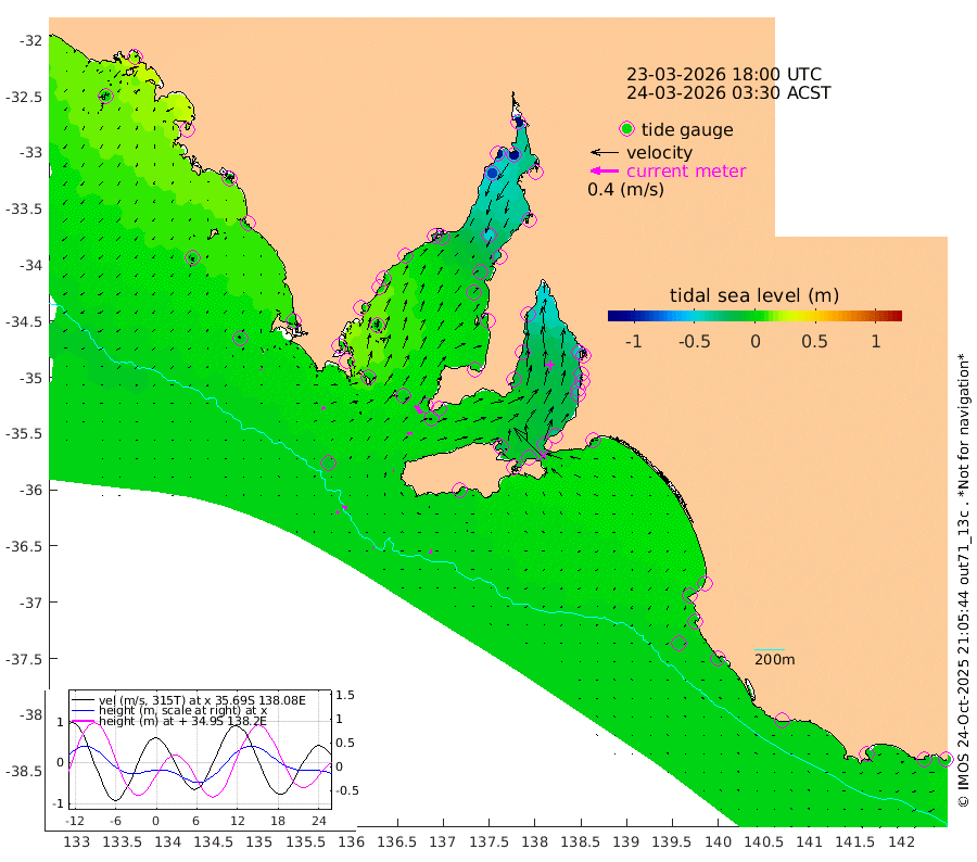1cm/s -62T +10cm/s rms + 5cm/s 114T. SAM1DS 520m 5cm/s 81T +13cm/s rms + 5cm/s -36T. SAM2CP 100m 7cm/s 114T +21cm/s rms + 18cm/s 142T. SAM3MS 168m 6cm/s -176T +22cm/s rms + 0cm/s -30T. SAM4CY 117m 1cm/s 173T +23cm/s rms + 2cm/s 99T. SAM5CB 94m 8cm/s 88T +8cm/s rms + 3cm/s -172T. SAM6IS 83m 4cm/s 121T +11cm/s rms + 7cm/s 150T. SAM7DS 519m 14cm/s 142T +10cm/s rms + 2cm/s 87T. SAM8SG 47m 2cm/s 90T +20cm/s rms + 12cm/s -168T. NRSKAI 101m -5cm Warrnambool -6cm Port Fairy -6cm Portland -1cm Port Macdonnell -7cm Beachport -6cm Cape Rabelais (off) -2cm Robe -1cm Cape Jaffa 0cm Kingston -6cm Victor Harbor -7cm Vivonne Bay -21cm Kingscote -21cm American River -13cm Penneshaw -22cm Cape Jervis -30cm Second Valley -32cm Port Noarlunga -32cm Port Stanvac -35cm Brighton -32cm Glenelg -38cm Port Adelaide (Outer Harbor) -63cm Angus Inlet (Garden Island) -41cm Ardrossan -21cm Port Vincent -18cm Port Giles 3cm Stenhouse Bay -2cm Althorpe Island 1cm Pondalowie Bay 1cm Point Turton 0cm Port Victoria -5cm Cape Elizabeth -16cm Tiparra Reef Light -37cm Wallaroo -46cm Middle Bank -15cm Port Broughton -108cm Port Pirie -122cm Red Cliff Point (Beacon 5) -107cm Port Bonython -101cm Whyalla -89cm Western Shoal Beacon -24cm Franklin Harbor -14cm Franklin Harbor Entrance Beacon -5cm Arno Bay 2cm Port Neill 1cm Cape Hardy 4cm Tumby Bay -1cm Reevesby Island 6cm Port Lincoln 4cm Taylors Landing 1cm Whalers Bay 0cm Wedge Island Mooring -8cm Shelf Edge Mooring 3cm Coffin Bay Entrance Beacon -5cm Greenly Island 4cm Elliston -1cm Pearson Island 7cm Venus Bay 19cm Blanche Port (Streaky Bay) 16cm Thevenard 2cm St Francis Island