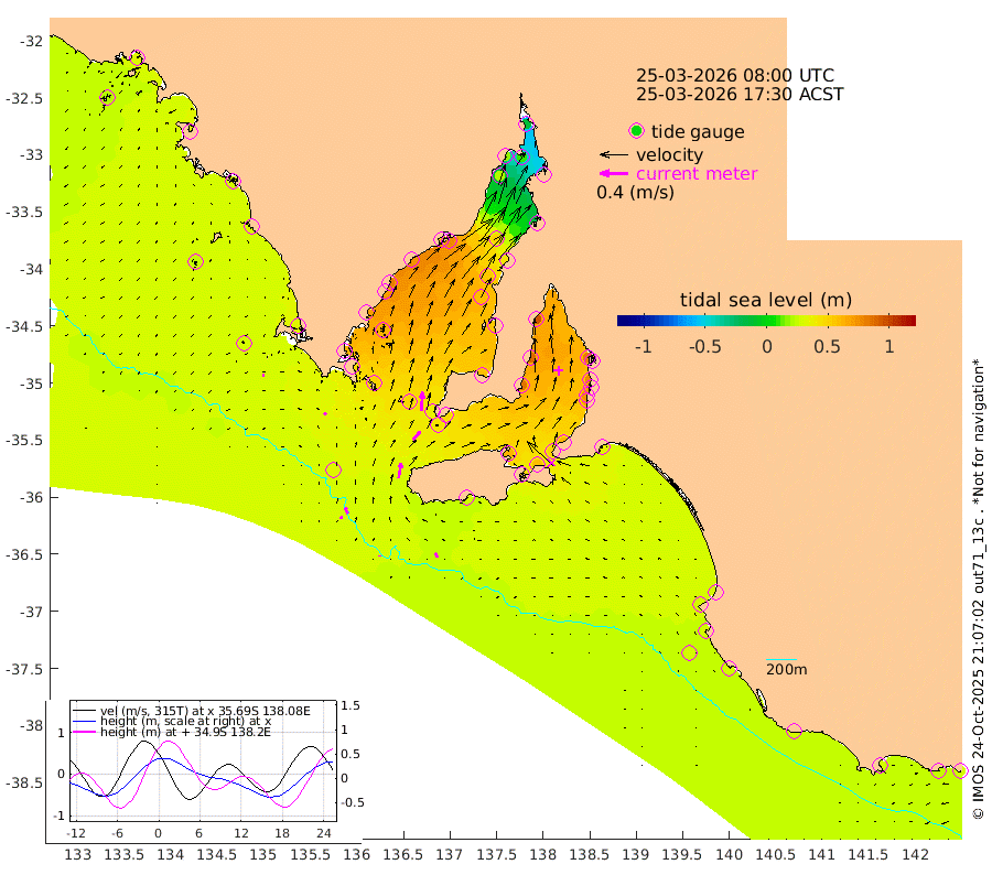 0cm/s 9T +10cm/s rms + 5cm/s 114T. SAM1DS 520m 4cm/s -57T +13cm/s rms + 5cm/s -36T. SAM2CP 100m 9cm/s -22T +21cm/s rms + 18cm/s 142T. SAM3MS 168m 7cm/s -30T +22cm/s rms + 0cm/s -30T. SAM4CY 117m 3cm/s -112T +23cm/s rms + 2cm/s 99T. SAM5CB 94m 15cm/s 41T +8cm/s rms + 3cm/s -172T. SAM6IS 83m 4cm/s -9T +11cm/s rms + 7cm/s 150T. SAM7DS 519m 27cm/s 4T +10cm/s rms + 2cm/s 87T. SAM8SG 47m 21cm/s 9T +20cm/s rms + 12cm/s -168T. NRSKAI 101m 26cm Warrnambool 25cm Port Fairy 27cm Portland 29cm Port Macdonnell 28cm Beachport 28cm Cape Rabelais (off) 28cm Robe 30cm Cape Jaffa 28cm Kingston 34cm Victor Harbor 27cm Vivonne Bay 61cm Kingscote 52cm American River 59cm Penneshaw 51cm Cape Jervis 61cm Second Valley 71cm Port Noarlunga 74cm Port Stanvac 74cm Brighton 77cm Glenelg 80cm Port Adelaide (Outer Harbor) 61cm Angus Inlet (Garden Island) 95cm Ardrossan 88cm Port Vincent 83cm Port Giles 46cm Stenhouse Bay 44cm Althorpe Island 37cm Pondalowie Bay 56cm Point Turton 56cm Port Victoria 58cm Cape Elizabeth 56cm Tiparra Reef Light 45cm Wallaroo 51cm Middle Bank -16cm Port Broughton -7cm Port Pirie -13cm Red Cliff Point (Beacon 5) 8cm Port Bonython 17cm Whyalla 21cm Western Shoal Beacon 53cm Franklin Harbor 76cm Franklin Harbor Entrance Beacon 74cm Arno Bay 79cm Port Neill 71cm Cape Hardy 68cm Tumby Bay 60cm Reevesby Island 60cm Port Lincoln 48cm Taylors Landing 52cm Whalers Bay 45cm Wedge Island Mooring 30cm Shelf Edge Mooring 33cm Coffin Bay Entrance Beacon 28cm Greenly Island 32cm Elliston 26cm Pearson Island 27cm Venus Bay 35cm Blanche Port (Streaky Bay) 32cm Thevenard 21cm St Francis Island