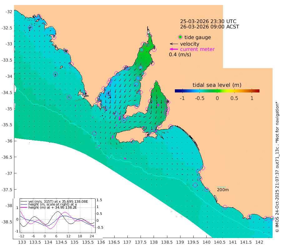 1cm/s 116T +10cm/s rms + 5cm/s 114T. SAM1DS 520m 2cm/s 97T +13cm/s rms + 5cm/s -36T. SAM2CP 100m 5cm/s 119T +21cm/s rms + 18cm/s 142T. SAM3MS 168m 11cm/s 118T +22cm/s rms + 0cm/s -30T. SAM4CY 117m 2cm/s 69T +23cm/s rms + 2cm/s 99T. SAM5CB 94m 7cm/s -138T +8cm/s rms + 3cm/s -172T. SAM6IS 83m 1cm/s 128T +11cm/s rms + 7cm/s 150T. SAM7DS 519m 17cm/s 177T +10cm/s rms + 2cm/s 87T. SAM8SG 47m 14cm/s -171T +20cm/s rms + 12cm/s -168T. NRSKAI 101m -53cm Warrnambool -49cm Port Fairy -49cm Portland -48cm Port Macdonnell -44cm Beachport -46cm Cape Rabelais (off) -47cm Robe -50cm Cape Jaffa -48cm Kingston -47cm Victor Harbor -37cm Vivonne Bay -31cm Kingscote -29cm American River -39cm Penneshaw -30cm Cape Jervis -23cm Second Valley -19cm Port Noarlunga -20cm Port Stanvac -17cm Brighton -18cm Glenelg -15cm Port Adelaide (Outer Harbor) -3cm Angus Inlet (Garden Island) -11cm Ardrossan -17cm Port Vincent -28cm Port Giles -43cm Stenhouse Bay -47cm Althorpe Island -41cm Pondalowie Bay -55cm Point Turton -54cm Port Victoria -52cm Cape Elizabeth -57cm Tiparra Reef Light -50cm Wallaroo -51cm Middle Bank -24cm Port Broughton -28cm Port Pirie -20cm Red Cliff Point (Beacon 5) -25cm Port Bonython -32cm Whyalla -35cm Western Shoal Beacon -47cm Franklin Harbor -61cm Franklin Harbor Entrance Beacon -60cm Arno Bay -65cm Port Neill -61cm Cape Hardy -60cm Tumby Bay -57cm Reevesby Island -58cm Port Lincoln -50cm Taylors Landing -51cm Whalers Bay -48cm Wedge Island Mooring -40cm Shelf Edge Mooring -48cm Coffin Bay Entrance Beacon -41cm Greenly Island -46cm Elliston -39cm Pearson Island -41cm Venus Bay -58cm Blanche Port (Streaky Bay) -55cm Thevenard -51cm St Francis Island