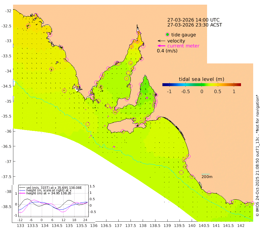 1cm/s -89T +10cm/s rms + 5cm/s 114T. SAM1DS 520m 3cm/s -110T +13cm/s rms + 5cm/s -36T. SAM2CP 100m 5cm/s -102T +21cm/s rms + 18cm/s 142T. SAM3MS 168m 10cm/s -68T +22cm/s rms + 0cm/s -30T. SAM4CY 117m 2cm/s -38T +23cm/s rms + 2cm/s 99T. SAM5CB 94m 4cm/s -95T +8cm/s rms + 3cm/s -172T. SAM6IS 83m 2cm/s -114T +11cm/s rms + 7cm/s 150T. SAM7DS 519m 11cm/s -30T +10cm/s rms + 2cm/s 87T. SAM8SG 47m 3cm/s -3T +20cm/s rms + 12cm/s -168T. NRSKAI 101m 25cm Warrnambool 26cm Port Fairy 27cm Portland 29cm Port Macdonnell 27cm Beachport 29cm Cape Rabelais (off) 29cm Robe 34cm Cape Jaffa 31cm Kingston 31cm Victor Harbor 25cm Vivonne Bay 24cm Kingscote 28cm American River 25cm Penneshaw 25cm Cape Jervis 22cm Second Valley 19cm Port Noarlunga 18cm Port Stanvac 19cm Brighton 19cm Glenelg 16cm Port Adelaide (Outer Harbor) 20cm Angus Inlet (Garden Island) 12cm Ardrossan 22cm Port Vincent 16cm Port Giles 25cm Stenhouse Bay 31cm Althorpe Island 28cm Pondalowie Bay 31cm Point Turton 35cm Port Victoria 36cm Cape Elizabeth 38cm Tiparra Reef Light 46cm Wallaroo 47cm Middle Bank 45cm Port Broughton 70cm Port Pirie 69cm Red Cliff Point (Beacon 5) 62cm Port Bonython 62cm Whyalla 60cm Western Shoal Beacon 36cm Franklin Harbor 36cm Franklin Harbor Entrance Beacon 34cm Arno Bay 32cm Port Neill 34cm Cape Hardy 34cm Tumby Bay 35cm Reevesby Island 32cm Port Lincoln 31cm Taylors Landing 33cm Whalers Bay 32cm Wedge Island Mooring 30cm Shelf Edge Mooring 37cm Coffin Bay Entrance Beacon 31cm Greenly Island 37cm Elliston 36cm Pearson Island 32cm Venus Bay 47cm Blanche Port (Streaky Bay) 45cm Thevenard 41cm St Francis Island