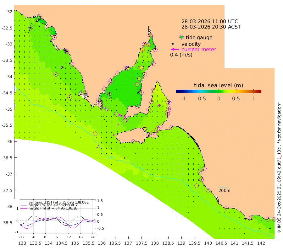 0cm/s -31T +10cm/s rms + 5cm/s 114T. SAM1DS 520m 2cm/s -50T +13cm/s rms + 5cm/s -36T. SAM2CP 100m 7cm/s -47T +21cm/s rms + 18cm/s 142T. SAM3MS 168m 8cm/s -23T +22cm/s rms + 0cm/s -30T. SAM4CY 117m 2cm/s -9T +23cm/s rms + 2cm/s 99T. SAM5CB 94m 6cm/s 19T +8cm/s rms + 3cm/s -172T. SAM6IS 83m 3cm/s -46T +11cm/s rms + 7cm/s 150T. SAM7DS 519m 15cm/s -9T +10cm/s rms + 2cm/s 87T. SAM8SG 47m 9cm/s 3T +20cm/s rms + 12cm/s -168T. NRSKAI 101m 15cm Warrnambool 16cm Port Fairy 18cm Portland 16cm Port Macdonnell 20cm Beachport 19cm Cape Rabelais (off) 17cm Robe 19cm Cape Jaffa 18cm Kingston 21cm Victor Harbor 19cm Vivonne Bay 22cm Kingscote 22cm American River 22cm Penneshaw 20cm Cape Jervis 26cm Second Valley 21cm Port Noarlunga 21cm Port Stanvac 23cm Brighton 22cm Glenelg 23cm Port Adelaide (Outer Harbor) 27cm Angus Inlet (Garden Island) 21cm Ardrossan 23cm Port Vincent 18cm Port Giles 14cm Stenhouse Bay 17cm Althorpe Island 14cm Pondalowie Bay 11cm Point Turton 12cm Port Victoria 19cm Cape Elizabeth 18cm Tiparra Reef Light 26cm Wallaroo 32cm Middle Bank 13cm Port Broughton 57cm Port Pirie 66cm Red Cliff Point (Beacon 5) 54cm Port Bonython 54cm Whyalla 47cm Western Shoal Beacon 23cm Franklin Harbor 23cm Franklin Harbor Entrance Beacon 18cm Arno Bay 17cm Port Neill 18cm Cape Hardy 18cm Tumby Bay 15cm Reevesby Island 15cm Port Lincoln 18cm Taylors Landing 13cm Whalers Bay 18cm Wedge Island Mooring 22cm Shelf Edge Mooring 17cm Coffin Bay Entrance Beacon 19cm Greenly Island 18cm Elliston 18cm Pearson Island 10cm Venus Bay 12cm Blanche Port (Streaky Bay) 12cm Thevenard 10cm St Francis Island