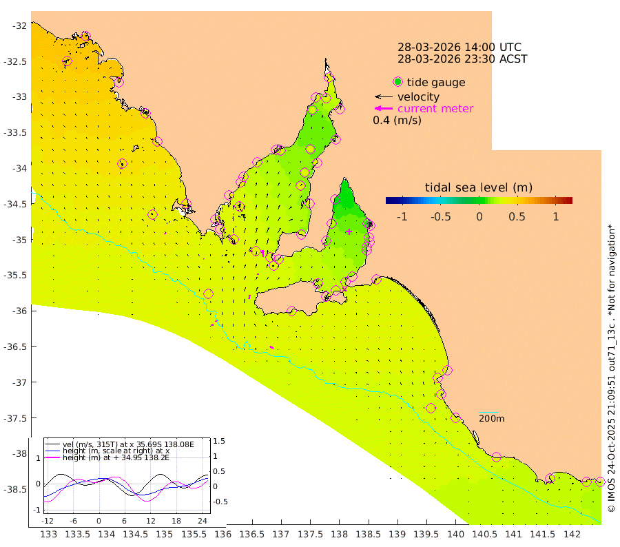 1cm/s -77T +10cm/s rms + 5cm/s 114T. SAM1DS 520m 1cm/s -42T +13cm/s rms + 5cm/s -36T. SAM2CP 100m 4cm/s -75T +21cm/s rms + 18cm/s 142T. SAM3MS 168m 9cm/s -60T +22cm/s rms + 0cm/s -30T. SAM4CY 117m 2cm/s -28T +23cm/s rms + 2cm/s 99T. SAM5CB 94m 4cm/s 4T +8cm/s rms + 3cm/s -172T. SAM6IS 83m 2cm/s -91T +11cm/s rms + 7cm/s 150T. SAM7DS 519m 15cm/s -5T +10cm/s rms + 2cm/s 87T. SAM8SG 47m 9cm/s 7T +20cm/s rms + 12cm/s -168T. NRSKAI 101m 25cm Warrnambool 27cm Port Fairy 29cm Portland 31cm Port Macdonnell 30cm Beachport 32cm Cape Rabelais (off) 31cm Robe 37cm Cape Jaffa 34cm Kingston 35cm Victor Harbor 30cm Vivonne Bay 23cm Kingscote 25cm American River 27cm Penneshaw 23cm Cape Jervis 18cm Second Valley 14cm Port Noarlunga 13cm Port Stanvac 13cm Brighton 14cm Glenelg 10cm Port Adelaide (Outer Harbor) 5cm Angus Inlet (Garden Island) 5cm Ardrossan 23cm Port Vincent 15cm Port Giles 29cm Stenhouse Bay 33cm Althorpe Island 31cm Pondalowie Bay 31cm Point Turton 35cm Port Victoria 36cm Cape Elizabeth 32cm Tiparra Reef Light 34cm Wallaroo 35cm Middle Bank 29cm Port Broughton 37cm Port Pirie 34cm Red Cliff Point (Beacon 5) 33cm Port Bonython 34cm Whyalla 34cm Western Shoal Beacon 29cm Franklin Harbor 36cm Franklin Harbor Entrance Beacon 37cm Arno Bay 37cm Port Neill 40cm Cape Hardy 41cm Tumby Bay 40cm Reevesby Island 40cm Port Lincoln 39cm Taylors Landing 35cm Whalers Bay 37cm Wedge Island Mooring 35cm Shelf Edge Mooring 43cm Coffin Bay Entrance Beacon 37cm Greenly Island 45cm Elliston 44cm Pearson Island 36cm Venus Bay 58cm Blanche Port (Streaky Bay) 56cm Thevenard 45cm St Francis Island