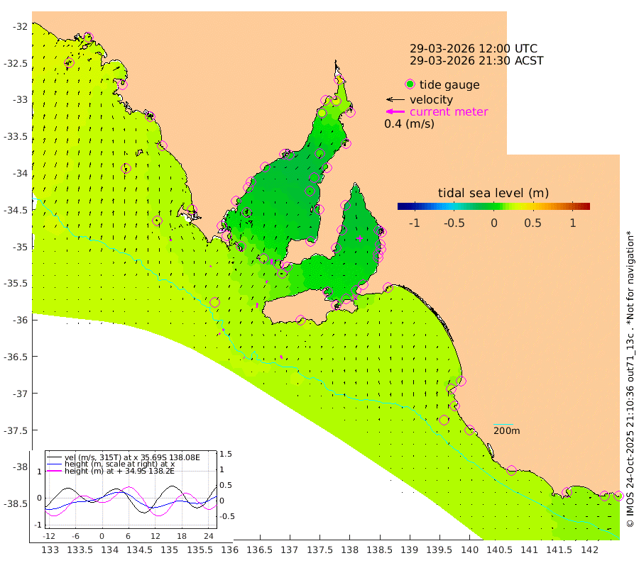 1cm/s -51T +10cm/s rms + 5cm/s 114T. SAM1DS 520m 3cm/s 24T +13cm/s rms + 5cm/s -36T. SAM2CP 100m 4cm/s -44T +21cm/s rms + 18cm/s 142T. SAM3MS 168m 7cm/s -23T +22cm/s rms + 0cm/s -30T. SAM4CY 117m 4cm/s 1T +23cm/s rms + 2cm/s 99T. SAM5CB 94m 6cm/s 28T +8cm/s rms + 3cm/s -172T. SAM6IS 83m 2cm/s -51T +11cm/s rms + 7cm/s 150T. SAM7DS 519m 13cm/s 3T +10cm/s rms + 2cm/s 87T. SAM8SG 47m 9cm/s 6T +20cm/s rms + 12cm/s -168T. NRSKAI 101m 17cm Warrnambool 18cm Port Fairy 20cm Portland 18cm Port Macdonnell 22cm Beachport 23cm Cape Rabelais (off) 20cm Robe 23cm Cape Jaffa 22cm Kingston 23cm Victor Harbor 23cm Vivonne Bay 2cm Kingscote 5cm American River 8cm Penneshaw 4cm Cape Jervis 1cm Second Valley -10cm Port Noarlunga -11cm Port Stanvac -10cm Brighton -12cm Glenelg -15cm Port Adelaide (Outer Harbor) -12cm Angus Inlet (Garden Island) -24cm Ardrossan -10cm Port Vincent -13cm Port Giles 9cm Stenhouse Bay 13cm Althorpe Island 12cm Pondalowie Bay 1cm Point Turton 2cm Port Victoria 7cm Cape Elizabeth 3cm Tiparra Reef Light 9cm Wallaroo 11cm Middle Bank 13cm Port Broughton 39cm Port Pirie 46cm Red Cliff Point (Beacon 5) 32cm Port Bonython 29cm Whyalla 24cm Western Shoal Beacon 2cm Franklin Harbor 4cm Franklin Harbor Entrance Beacon 4cm Arno Bay 4cm Port Neill 8cm Cape Hardy 11cm Tumby Bay 9cm Reevesby Island 12cm Port Lincoln 18cm Taylors Landing 6cm Whalers Bay 16cm Wedge Island Mooring 24cm Shelf Edge Mooring 24cm Coffin Bay Entrance Beacon 24cm Greenly Island 25cm Elliston 27cm Pearson Island 15cm Venus Bay 26cm Blanche Port (Streaky Bay) 25cm Thevenard 24cm St Francis Island