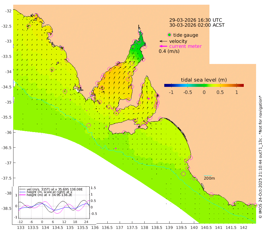 1cm/s -74T +10cm/s rms + 5cm/s 114T. SAM1DS 520m 2cm/s -121T +13cm/s rms + 5cm/s -36T. SAM2CP 100m 2cm/s -85T +21cm/s rms + 18cm/s 142T. SAM3MS 168m 8cm/s -84T +22cm/s rms + 0cm/s -30T. SAM4CY 117m 3cm/s -147T +23cm/s rms + 2cm/s 99T. SAM5CB 94m 2cm/s 37T +8cm/s rms + 3cm/s -172T. SAM6IS 83m 1cm/s -146T +11cm/s rms + 7cm/s 150T. SAM7DS 519m 9cm/s -8T +10cm/s rms + 2cm/s 87T. SAM8SG 47m 6cm/s 10T +20cm/s rms + 12cm/s -168T. NRSKAI 101m 18cm Warrnambool 19cm Port Fairy 19cm Portland 23cm Port Macdonnell 18cm Beachport 20cm Cape Rabelais (off) 21cm Robe 26cm Cape Jaffa 23cm Kingston 24cm Victor Harbor 15cm Vivonne Bay 34cm Kingscote 31cm American River 33cm Penneshaw 29cm Cape Jervis 29cm Second Valley 36cm Port Noarlunga 38cm Port Stanvac 36cm Brighton 40cm Glenelg 39cm Port Adelaide (Outer Harbor) 24cm Angus Inlet (Garden Island) 44cm Ardrossan 50cm Port Vincent 43cm Port Giles 31cm Stenhouse Bay 31cm Althorpe Island 30cm Pondalowie Bay 46cm Point Turton 50cm Port Victoria 48cm Cape Elizabeth 42cm Tiparra Reef Light 35cm Wallaroo 36cm Middle Bank 14cm Port Broughton -5cm Port Pirie -13cm Red Cliff Point (Beacon 5) 1cm Port Bonython 6cm Whyalla 11cm Western Shoal Beacon 41cm Franklin Harbor 53cm Franklin Harbor Entrance Beacon 53cm Arno Bay 55cm Port Neill 50cm Cape Hardy 49cm Tumby Bay 46cm Reevesby Island 44cm Port Lincoln 35cm Taylors Landing 42cm Whalers Bay 34cm Wedge Island Mooring 20cm Shelf Edge Mooring 31cm Coffin Bay Entrance Beacon 22cm Greenly Island 30cm Elliston 25cm Pearson Island 29cm Venus Bay 44cm Blanche Port (Streaky Bay) 42cm Thevenard 26cm St Francis Island