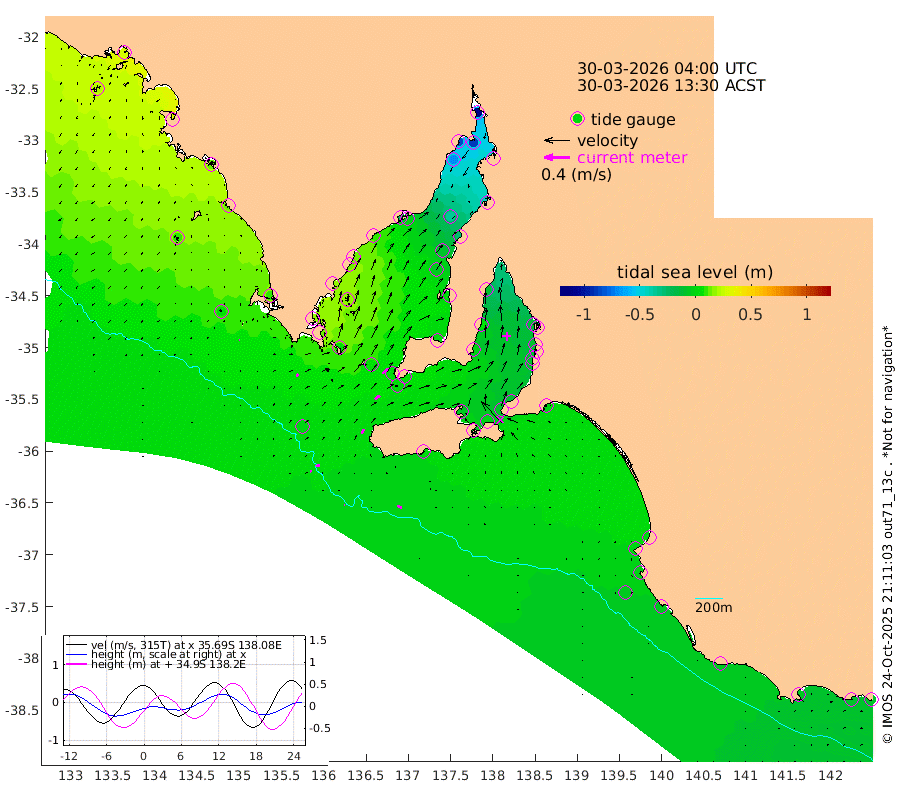 1cm/s 112T +10cm/s rms + 5cm/s 114T. SAM1DS 520m 4cm/s 51T +13cm/s rms + 5cm/s -36T. SAM2CP 100m 6cm/s 74T +21cm/s rms + 18cm/s 142T. SAM3MS 168m 8cm/s 112T +22cm/s rms + 0cm/s -30T. SAM4CY 117m 1cm/s -89T +23cm/s rms + 2cm/s 99T. SAM5CB 94m 10cm/s 56T +8cm/s rms + 3cm/s -172T. SAM6IS 83m 3cm/s 81T +11cm/s rms + 7cm/s 150T. SAM7DS 519m 11cm/s 55T +10cm/s rms + 2cm/s 87T. SAM8SG 47m 7cm/s 22T +20cm/s rms + 12cm/s -168T. NRSKAI 101m -9cm Warrnambool -8cm Port Fairy -7cm Portland -4cm Port Macdonnell -5cm Beachport -4cm Cape Rabelais (off) -3cm Robe -3cm Cape Jaffa -2cm Kingston -1cm Victor Harbor 2cm Vivonne Bay -7cm Kingscote -9cm American River -2cm Penneshaw -8cm Cape Jervis -15cm Second Valley -9cm Port Noarlunga -10cm Port Stanvac -12cm Brighton -10cm Glenelg -13cm Port Adelaide (Outer Harbor) -34cm Angus Inlet (Garden Island) -9cm Ardrossan 4cm Port Vincent -1cm Port Giles 6cm Stenhouse Bay 2cm Althorpe Island 4cm Pondalowie Bay 3cm Point Turton 2cm Port Victoria -4cm Cape Elizabeth -9cm Tiparra Reef Light -30cm Wallaroo -36cm Middle Bank -42cm Port Broughton -98cm Port Pirie -109cm Red Cliff Point (Beacon 5) -90cm Port Bonython -86cm Whyalla -70cm Western Shoal Beacon -24cm Franklin Harbor -3cm Franklin Harbor Entrance Beacon 8cm Arno Bay 14cm Port Neill 15cm Cape Hardy 17cm Tumby Bay 17cm Reevesby Island 18cm Port Lincoln 12cm Taylors Landing 6cm Whalers Bay 5cm Wedge Island Mooring 0cm Shelf Edge Mooring 11cm Coffin Bay Entrance Beacon 6cm Greenly Island 12cm Elliston 11cm Pearson Island 12cm Venus Bay 29cm Blanche Port (Streaky Bay) 30cm Thevenard 21cm St Francis Island