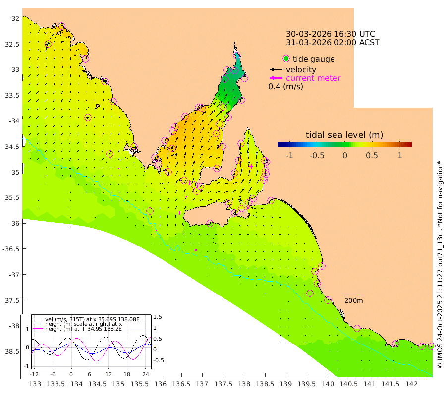 1cm/s -63T +10cm/s rms + 5cm/s 114T. SAM1DS 520m 1cm/s -90T +13cm/s rms + 5cm/s -36T. SAM2CP 100m 2cm/s -27T +21cm/s rms + 18cm/s 142T. SAM3MS 168m 6cm/s -83T +22cm/s rms + 0cm/s -30T. SAM4CY 117m 3cm/s -142T +23cm/s rms + 2cm/s 99T. SAM5CB 94m 6cm/s 48T +8cm/s rms + 3cm/s -172T. SAM6IS 83m 0cm/s 46T +11cm/s rms + 7cm/s 150T. SAM7DS 519m 13cm/s 9T +10cm/s rms + 2cm/s 87T. SAM8SG 47m 10cm/s 12T +20cm/s rms + 12cm/s -168T. NRSKAI 101m 14cm Warrnambool 14cm Port Fairy 15cm Portland 20cm Port Macdonnell 16cm Beachport 18cm Cape Rabelais (off) 19cm Robe 23cm Cape Jaffa 22cm Kingston 23cm Victor Harbor 15cm Vivonne Bay 34cm Kingscote 29cm American River 34cm Penneshaw 28cm Cape Jervis 27cm Second Valley 35cm Port Noarlunga 37cm Port Stanvac 35cm Brighton 40cm Glenelg 38cm Port Adelaide (Outer Harbor) 16cm Angus Inlet (Garden Island) 45cm Ardrossan 58cm Port Vincent 46cm Port Giles 33cm Stenhouse Bay 30cm Althorpe Island 30cm Pondalowie Bay 44cm Point Turton 49cm Port Victoria 47cm Cape Elizabeth 36cm Tiparra Reef Light 23cm Wallaroo 23cm Middle Bank -2cm Port Broughton -39cm Port Pirie -48cm Red Cliff Point (Beacon 5) -28cm Port Bonython -23cm Whyalla -15cm Western Shoal Beacon 33cm Franklin Harbor 51cm Franklin Harbor Entrance Beacon 54cm Arno Bay 58cm Port Neill 54cm Cape Hardy 54cm Tumby Bay 49cm Reevesby Island 48cm Port Lincoln 38cm Taylors Landing 42cm Whalers Bay 36cm Wedge Island Mooring 20cm Shelf Edge Mooring 32cm Coffin Bay Entrance Beacon 23cm Greenly Island 32cm Elliston 27cm Pearson Island 30cm Venus Bay 49cm Blanche Port (Streaky Bay) 47cm Thevenard 26cm St Francis Island