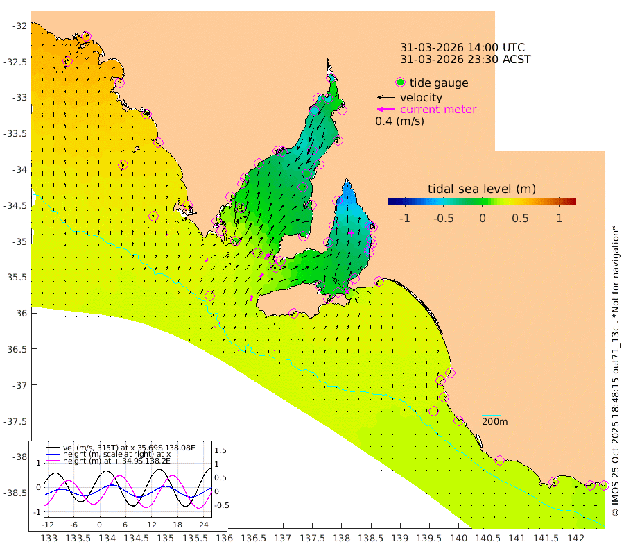 1cm/s -62T +10cm/s rms + 5cm/s 114T. SAM1DS 520m 7cm/s 55T +13cm/s rms + 5cm/s -36T. SAM2CP 100m 3cm/s 58T +21cm/s rms + 18cm/s 142T. SAM3MS 168m 3cm/s -35T +22cm/s rms + 0cm/s -30T. SAM4CY 117m 4cm/s -1T +23cm/s rms + 2cm/s 99T. SAM5CB 94m 11cm/s 49T +8cm/s rms + 3cm/s -172T. SAM6IS 83m 1cm/s 48T +11cm/s rms + 7cm/s 150T. SAM7DS 519m 15cm/s 36T +10cm/s rms + 2cm/s 87T. SAM8SG 47m 12cm/s 14T +20cm/s rms + 12cm/s -168T. NRSKAI 101m 20cm Warrnambool 22cm Port Fairy 23cm Portland 24cm Port Macdonnell 25cm Beachport 27cm Cape Rabelais (off) 26cm Robe 30cm Cape Jaffa 30cm Kingston 27cm Victor Harbor 28cm Vivonne Bay -20cm Kingscote -15cm American River -4cm Penneshaw -15cm Cape Jervis -32cm Second Valley -46cm Port Noarlunga -49cm Port Stanvac -51cm Brighton -52cm Glenelg -62cm Port Adelaide (Outer Harbor) -76cm Angus Inlet (Garden Island) -76cm Ardrossan -40cm Port Vincent -41cm Port Giles 14cm Stenhouse Bay 15cm Althorpe Island 17cm Pondalowie Bay 0cm Point Turton 1cm Port Victoria 0cm Cape Elizabeth -10cm Tiparra Reef Light -22cm Wallaroo -27cm Middle Bank -1cm Port Broughton -41cm Port Pirie -46cm Red Cliff Point (Beacon 5) -47cm Port Bonython -50cm Whyalla -46cm Western Shoal Beacon -26cm Franklin Harbor -12cm Franklin Harbor Entrance Beacon 0cm Arno Bay 7cm Port Neill 12cm Cape Hardy 19cm Tumby Bay 16cm Reevesby Island 23cm Port Lincoln 29cm Taylors Landing 8cm Whalers Bay 22cm Wedge Island Mooring 29cm Shelf Edge Mooring 39cm Coffin Bay Entrance Beacon 33cm Greenly Island 42cm Elliston 43cm Pearson Island 30cm Venus Bay 60cm Blanche Port (Streaky Bay) 58cm Thevenard 51cm St Francis Island