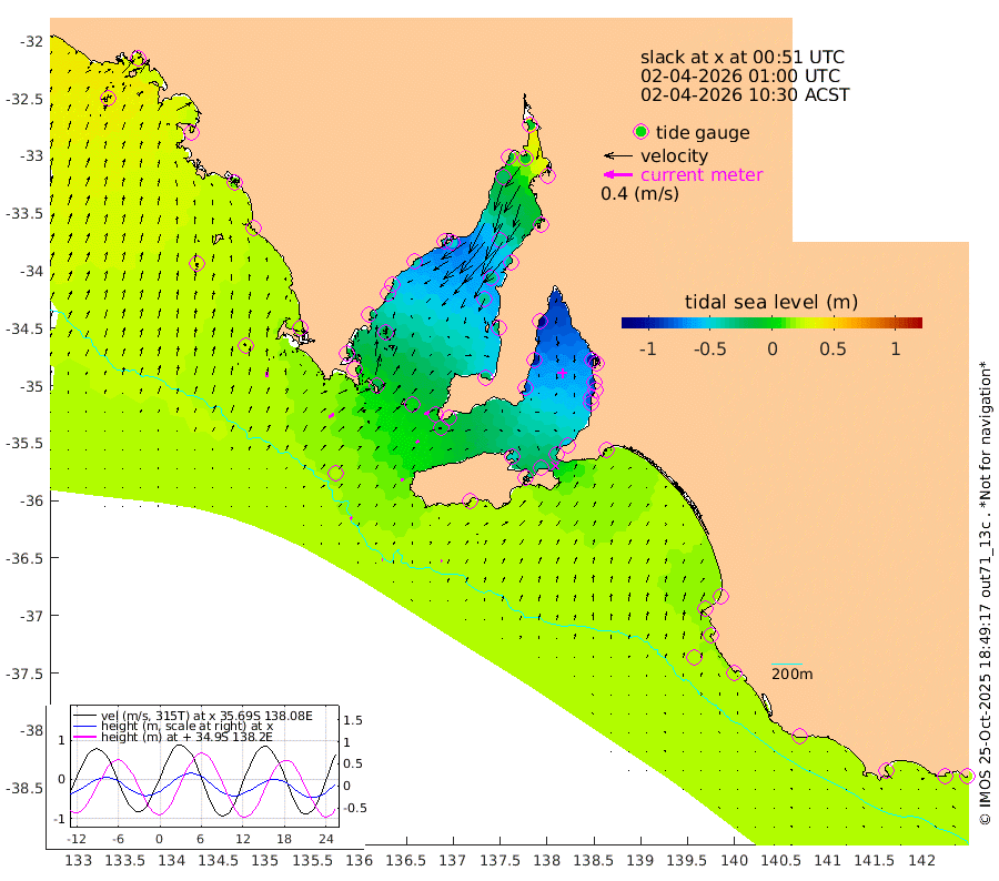 1cm/s 96T +10cm/s rms + 5cm/s 114T. SAM1DS 520m 8cm/s 55T +13cm/s rms + 5cm/s -36T. SAM2CP 100m 3cm/s 125T +21cm/s rms + 18cm/s 142T. SAM3MS 168m 2cm/s 62T +22cm/s rms + 0cm/s -30T. SAM4CY 117m 7cm/s 8T +23cm/s rms + 2cm/s 99T. SAM5CB 94m 5cm/s 53T +8cm/s rms + 3cm/s -172T. SAM6IS 83m 0cm/s 161T +11cm/s rms + 7cm/s 150T. SAM7DS 519m 8cm/s 66T +10cm/s rms + 2cm/s 87T. SAM8SG 47m 4cm/s 25T +20cm/s rms + 12cm/s -168T. NRSKAI 101m 22cm Warrnambool 22cm Port Fairy 22cm Portland 19cm Port Macdonnell 22cm Beachport 22cm Cape Rabelais (off) 21cm Robe 20cm Cape Jaffa 19cm Kingston 16cm Victor Harbor 25cm Vivonne Bay -45cm Kingscote -38cm American River -31cm Penneshaw -37cm Cape Jervis -55cm Second Valley -76cm Port Noarlunga -82cm Port Stanvac -82cm Brighton -88cm Glenelg -97cm Port Adelaide (Outer Harbor) -86cm Angus Inlet (Garden Island) -121cm Ardrossan -96cm Port Vincent -82cm Port Giles -6cm Stenhouse Bay -5cm Althorpe Island -1cm Pondalowie Bay -26cm Point Turton -29cm Port Victoria -34cm Cape Elizabeth -33cm Tiparra Reef Light -31cm Wallaroo -36cm Middle Bank 2cm Port Broughton 5cm Port Pirie -5cm Red Cliff Point (Beacon 5) -8cm Port Bonython -18cm Whyalla -24cm Western Shoal Beacon -43cm Franklin Harbor -45cm Franklin Harbor Entrance Beacon -38cm Arno Bay -38cm Port Neill -31cm Cape Hardy -24cm Tumby Bay -15cm Reevesby Island -8cm Port Lincoln 7cm Taylors Landing -19cm Whalers Bay 1cm Wedge Island Mooring 22cm Shelf Edge Mooring 21cm Coffin Bay Entrance Beacon 25cm Greenly Island 24cm Elliston 30cm Pearson Island 12cm Venus Bay 28cm Blanche Port (Streaky Bay) 31cm Thevenard 39cm St Francis Island