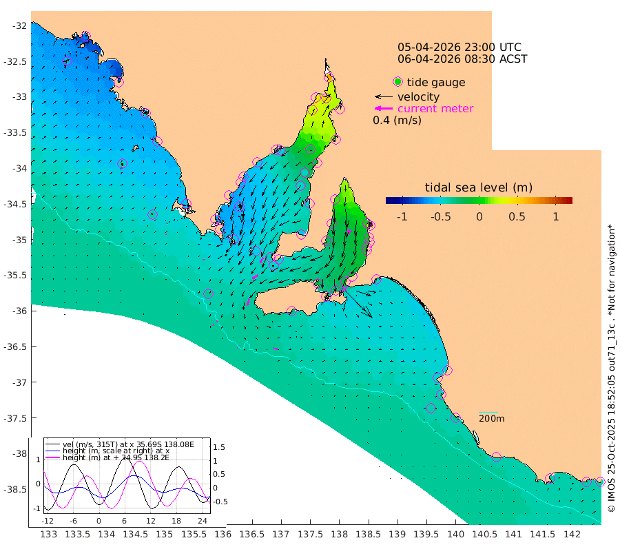 1cm/s 111T +10cm/s rms + 5cm/s 114T. SAM1DS 520m 2cm/s -145T +13cm/s rms + 5cm/s -36T. SAM2CP 100m 2cm/s -138T +21cm/s rms + 18cm/s 142T. SAM3MS 168m 8cm/s 99T +22cm/s rms + 0cm/s -30T. SAM4CY 117m 2cm/s 85T +23cm/s rms + 2cm/s 99T. SAM5CB 94m 15cm/s -123T +8cm/s rms + 3cm/s -172T. SAM6IS 83m 1cm/s -83T +11cm/s rms + 7cm/s 150T. SAM7DS 519m 14cm/s -151T +10cm/s rms + 2cm/s 87T. SAM8SG 47m 15cm/s -165T +20cm/s rms + 12cm/s -168T. NRSKAI 101m -41cm Warrnambool -39cm Port Fairy -40cm Portland -43cm Port Macdonnell -37cm Beachport -39cm Cape Rabelais (off) -42cm Robe -47cm Cape Jaffa -46cm Kingston -43cm Victor Harbor -34cm Vivonne Bay -21cm Kingscote -19cm American River -33cm Penneshaw -18cm Cape Jervis -8cm Second Valley -4cm Port Noarlunga -5cm Port Stanvac -1cm Brighton -4cm Glenelg 3cm Port Adelaide (Outer Harbor) 34cm Angus Inlet (Garden Island) 9cm Ardrossan -18cm Port Vincent -21cm Port Giles -45cm Stenhouse Bay -47cm Althorpe Island -42cm Pondalowie Bay -53cm Point Turton -51cm Port Victoria -48cm Cape Elizabeth -42cm Tiparra Reef Light -21cm Wallaroo -16cm Middle Bank -6cm Port Broughton 48cm Port Pirie 64cm Red Cliff Point (Beacon 5) 51cm Port Bonython 40cm Whyalla 26cm Western Shoal Beacon -31cm Franklin Harbor -51cm Franklin Harbor Entrance Beacon -56cm Arno Bay -67cm Port Neill -61cm Cape Hardy -63cm Tumby Bay -59cm Reevesby Island -64cm Port Lincoln -54cm Taylors Landing -52cm Whalers Bay -49cm Wedge Island Mooring -37cm Shelf Edge Mooring -54cm Coffin Bay Entrance Beacon -41cm Greenly Island -54cm Elliston -43cm Pearson Island -49cm Venus Bay -79cm Blanche Port (Streaky Bay) -74cm Thevenard -60cm St Francis Island