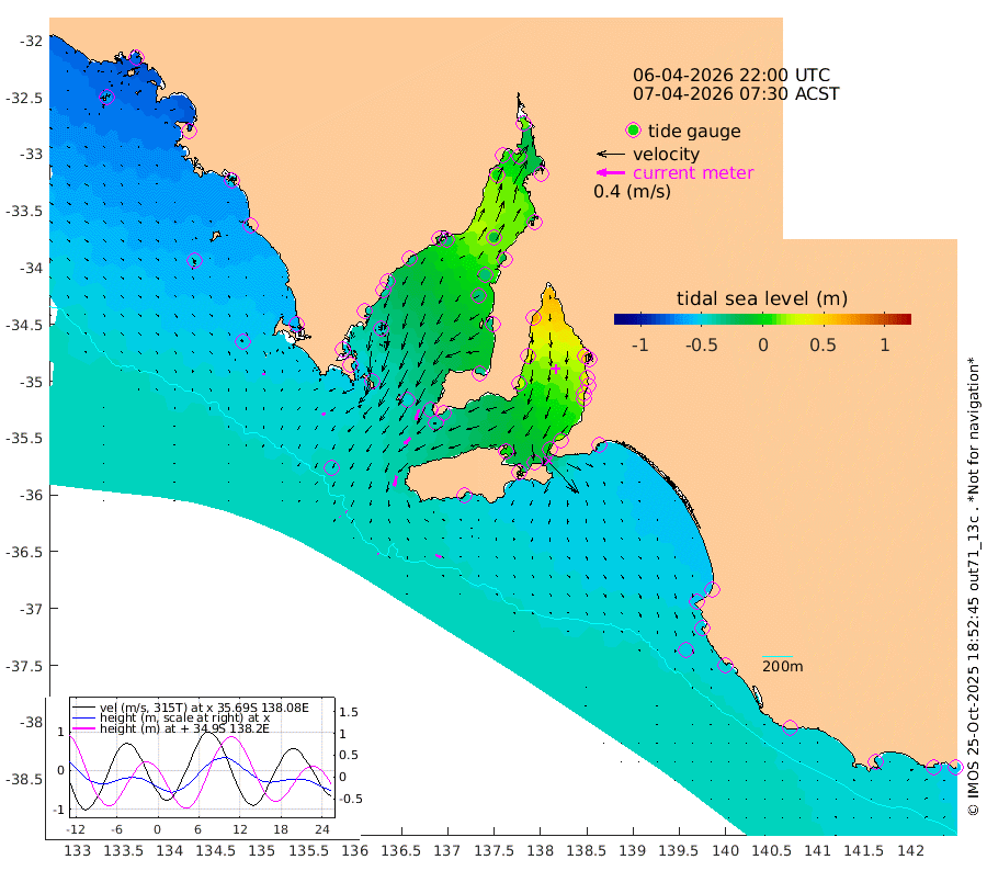 1cm/s 109T +10cm/s rms + 5cm/s 114T. SAM1DS 520m 4cm/s -137T +13cm/s rms + 5cm/s -36T. SAM2CP 100m 1cm/s 131T +21cm/s rms + 18cm/s 142T. SAM3MS 168m 8cm/s 117T +22cm/s rms + 0cm/s -30T. SAM4CY 117m 3cm/s 157T +23cm/s rms + 2cm/s 99T. SAM5CB 94m 12cm/s -131T +8cm/s rms + 3cm/s -172T. SAM6IS 83m 1cm/s -50T +11cm/s rms + 7cm/s 150T. SAM7DS 519m 15cm/s -161T +10cm/s rms + 2cm/s 87T. SAM8SG 47m 15cm/s -166T +20cm/s rms + 12cm/s -168T. NRSKAI 101m -53cm Warrnambool -50cm Port Fairy -50cm Portland -49cm Port Macdonnell -47cm Beachport -49cm Cape Rabelais (off) -50cm Robe -54cm Cape Jaffa -54cm Kingston -49cm Victor Harbor -44cm Vivonne Bay 2cm Kingscote 0cm American River -14cm Penneshaw 0cm Cape Jervis 17cm Second Valley 32cm Port Noarlunga 33cm Port Stanvac 38cm Brighton 37cm Glenelg 48cm Port Adelaide (Outer Harbor) 61cm Angus Inlet (Garden Island) 67cm Ardrossan 37cm Port Vincent 24cm Port Giles -35cm Stenhouse Bay -40cm Althorpe Island -38cm Pondalowie Bay -36cm Point Turton -33cm Port Victoria -29cm Cape Elizabeth -30cm Tiparra Reef Light -19cm Wallaroo -13cm Middle Bank -19cm Port Broughton 2cm Port Pirie 12cm Red Cliff Point (Beacon 5) 10cm Port Bonython 9cm Whyalla 3cm Western Shoal Beacon -15cm Franklin Harbor -29cm Franklin Harbor Entrance Beacon -34cm Arno Bay -44cm Port Neill -40cm Cape Hardy -44cm Tumby Bay -46cm Reevesby Island -51cm Port Lincoln -51cm Taylors Landing -36cm Whalers Bay -45cm Wedge Island Mooring -46cm Shelf Edge Mooring -60cm Coffin Bay Entrance Beacon -49cm Greenly Island -59cm Elliston -52cm Pearson Island -49cm Venus Bay -80cm Blanche Port (Streaky Bay) -78cm Thevenard -65cm St Francis Island