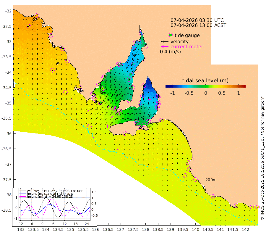 1cm/s 63T +10cm/s rms + 5cm/s 114T. SAM1DS 520m 11cm/s 48T +13cm/s rms + 5cm/s -36T. SAM2CP 100m 6cm/s 44T +21cm/s rms + 18cm/s 142T. SAM3MS 168m 7cm/s 56T +22cm/s rms + 0cm/s -30T. SAM4CY 117m 6cm/s -3T +23cm/s rms + 2cm/s 99T. SAM5CB 94m 18cm/s 47T +8cm/s rms + 3cm/s -172T. SAM6IS 83m 3cm/s 41T +11cm/s rms + 7cm/s 150T. SAM7DS 519m 27cm/s 30T +10cm/s rms + 2cm/s 87T. SAM8SG 47m 20cm/s 14T +20cm/s rms + 12cm/s -168T. NRSKAI 101m 35cm Warrnambool 33cm Port Fairy 33cm Portland 29cm Port Macdonnell 34cm Beachport 35cm Cape Rabelais (off) 33cm Robe 31cm Cape Jaffa 34cm Kingston 32cm Victor Harbor 40cm Vivonne Bay -35cm Kingscote -33cm American River -14cm Penneshaw -28cm Cape Jervis -52cm Second Valley -69cm Port Noarlunga -73cm Port Stanvac -77cm Brighton -78cm Glenelg -90cm Port Adelaide (Outer Harbor) -98cm Angus Inlet (Garden Island) -110cm Ardrossan -83cm Port Vincent -64cm Port Giles 13cm Stenhouse Bay 13cm Althorpe Island 15cm Pondalowie Bay -4cm Point Turton -9cm Port Victoria -17cm Cape Elizabeth -17cm Tiparra Reef Light -35cm Wallaroo -41cm Middle Bank -35cm Port Broughton -62cm Port Pirie -73cm Red Cliff Point (Beacon 5) -58cm Port Bonython -68cm Whyalla -63cm Western Shoal Beacon -46cm Franklin Harbor -19cm Franklin Harbor Entrance Beacon -3cm Arno Bay 8cm Port Neill 9cm Cape Hardy 16cm Tumby Bay 18cm Reevesby Island 27cm Port Lincoln 34cm Taylors Landing 3cm Whalers Bay 22cm Wedge Island Mooring 35cm Shelf Edge Mooring 43cm Coffin Bay Entrance Beacon 41cm Greenly Island 45cm Elliston 48cm Pearson Island 30cm Venus Bay 61cm Blanche Port (Streaky Bay) 64cm Thevenard 59cm St Francis Island