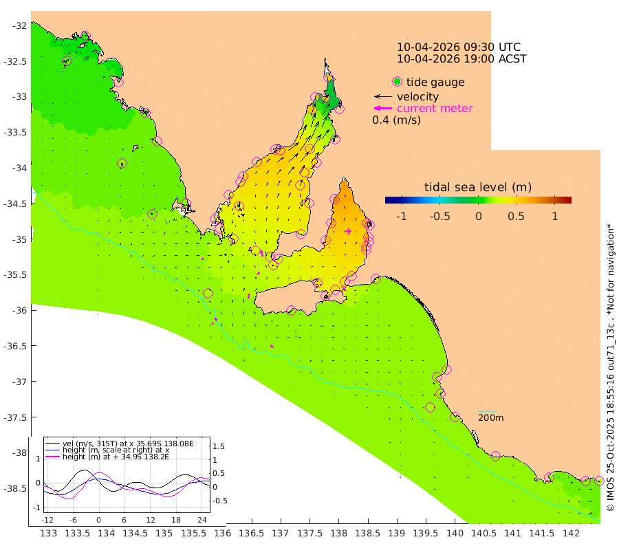 0cm/s -40T +10cm/s rms + 5cm/s 114T. SAM1DS 520m 5cm/s -99T +13cm/s rms + 5cm/s -36T. SAM2CP 100m 7cm/s -44T +21cm/s rms + 18cm/s 142T. SAM3MS 168m 7cm/s -43T +22cm/s rms + 0cm/s -30T. SAM4CY 117m 2cm/s -113T +23cm/s rms + 2cm/s 99T. SAM5CB 94m 6cm/s 35T +8cm/s rms + 3cm/s -172T. SAM6IS 83m 3cm/s -37T +11cm/s rms + 7cm/s 150T. SAM7DS 519m 15cm/s -18T +10cm/s rms + 2cm/s 87T. SAM8SG 47m 9cm/s 2T +20cm/s rms + 12cm/s -168T. NRSKAI 101m 16cm Warrnambool 16cm Port Fairy 17cm Portland 17cm Port Macdonnell 18cm Beachport 19cm Cape Rabelais (off) 16cm Robe 18cm Cape Jaffa 18cm Kingston 22cm Victor Harbor 16cm Vivonne Bay 48cm Kingscote 44cm American River 43cm Penneshaw 42cm Cape Jervis 53cm Second Valley 60cm Port Noarlunga 62cm Port Stanvac 64cm Brighton 66cm Glenelg 69cm Port Adelaide (Outer Harbor) 67cm Angus Inlet (Garden Island) 80cm Ardrossan 71cm Port Vincent 62cm Port Giles 27cm Stenhouse Bay 31cm Althorpe Island 23cm Pondalowie Bay 35cm Point Turton 34cm Port Victoria 40cm Cape Elizabeth 44cm Tiparra Reef Light 46cm Wallaroo 52cm Middle Bank 14cm Port Broughton 48cm Port Pirie 55cm Red Cliff Point (Beacon 5) 57cm Port Bonython 58cm Whyalla 55cm Western Shoal Beacon 45cm Franklin Harbor 52cm Franklin Harbor Entrance Beacon 46cm Arno Bay 52cm Port Neill 43cm Cape Hardy 40cm Tumby Bay 33cm Reevesby Island 31cm Port Lincoln 25cm Taylors Landing 32cm Whalers Bay 27cm Wedge Island Mooring 19cm Shelf Edge Mooring 17cm Coffin Bay Entrance Beacon 15cm Greenly Island 16cm Elliston 15cm Pearson Island 14cm Venus Bay 12cm Blanche Port (Streaky Bay) 10cm Thevenard 12cm St Francis Island