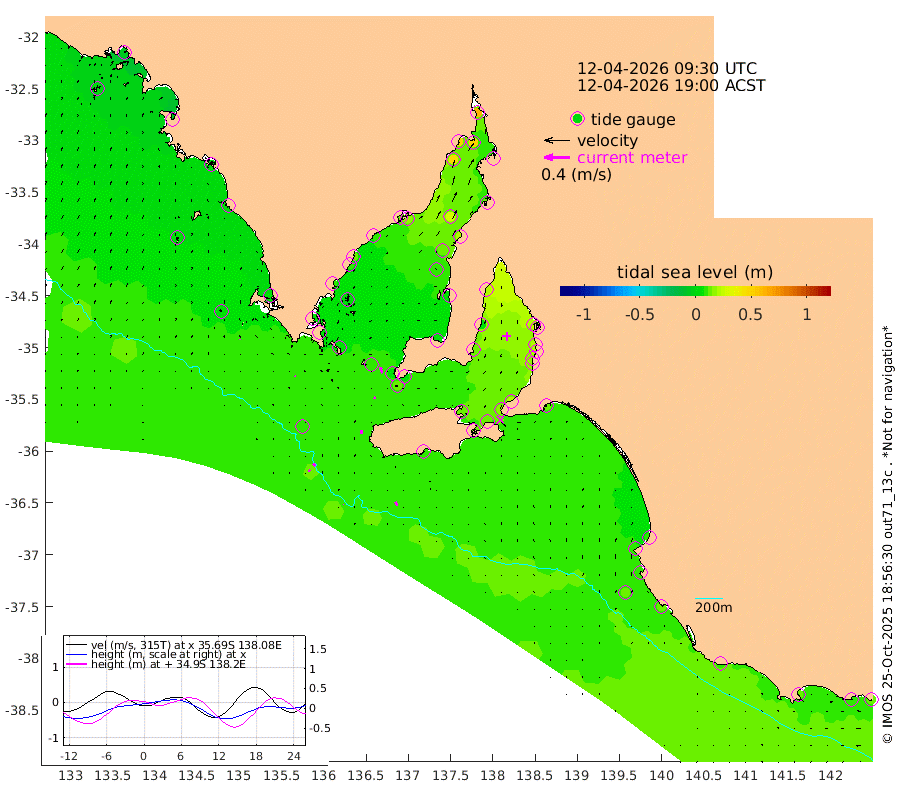 0cm/s -38T +10cm/s rms + 5cm/s 114T. SAM1DS 520m 2cm/s -81T +13cm/s rms + 5cm/s -36T. SAM2CP 100m 5cm/s -46T +21cm/s rms + 18cm/s 142T. SAM3MS 168m 6cm/s -21T +22cm/s rms + 0cm/s -30T. SAM4CY 117m 1cm/s -4T +23cm/s rms + 2cm/s 99T. SAM5CB 94m 4cm/s 7T +8cm/s rms + 3cm/s -172T. SAM6IS 83m 2cm/s -43T +11cm/s rms + 7cm/s 150T. SAM7DS 519m 10cm/s -18T +10cm/s rms + 2cm/s 87T. SAM8SG 47m 6cm/s -1T +20cm/s rms + 12cm/s -168T. NRSKAI 101m 11cm Warrnambool 10cm Port Fairy 11cm Portland 9cm Port Macdonnell 11cm Beachport 12cm Cape Rabelais (off) 9cm Robe 10cm Cape Jaffa 10cm Kingston 12cm Victor Harbor 10cm Vivonne Bay 15cm Kingscote 15cm American River 15cm Penneshaw 15cm Cape Jervis 21cm Second Valley 17cm Port Noarlunga 17cm Port Stanvac 20cm Brighton 20cm Glenelg 20cm Port Adelaide (Outer Harbor) 28cm Angus Inlet (Garden Island) 20cm Ardrossan 7cm Port Vincent 15cm Port Giles 7cm Stenhouse Bay 12cm Althorpe Island 6cm Pondalowie Bay 5cm Point Turton 5cm Port Victoria 8cm Cape Elizabeth 15cm Tiparra Reef Light 22cm Wallaroo 27cm Middle Bank 14cm Port Broughton 52cm Port Pirie 63cm Red Cliff Point (Beacon 5) 49cm Port Bonython 50cm Whyalla 46cm Western Shoal Beacon 15cm Franklin Harbor 16cm Franklin Harbor Entrance Beacon 11cm Arno Bay 12cm Port Neill 10cm Cape Hardy 10cm Tumby Bay 3cm Reevesby Island 6cm Port Lincoln 6cm Taylors Landing 7cm Whalers Bay 8cm Wedge Island Mooring 11cm Shelf Edge Mooring 5cm Coffin Bay Entrance Beacon 7cm Greenly Island 6cm Elliston 5cm Pearson Island 1cm Venus Bay -5cm Blanche Port (Streaky Bay) -4cm Thevenard 0cm St Francis Island