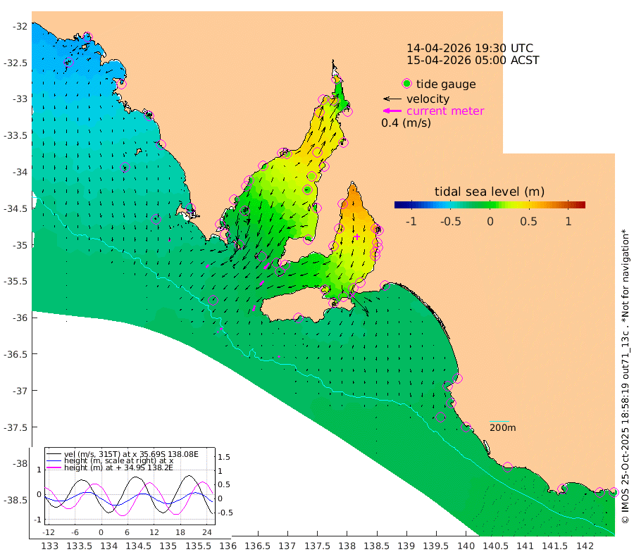 0cm/s -54T +10cm/s rms + 5cm/s 114T. SAM1DS 520m 7cm/s -134T +13cm/s rms + 5cm/s -36T. SAM2CP 100m 4cm/s -120T +21cm/s rms + 18cm/s 142T. SAM3MS 168m 4cm/s -134T +22cm/s rms + 0cm/s -30T. SAM4CY 117m 5cm/s 176T +23cm/s rms + 2cm/s 99T. SAM5CB 94m 12cm/s -133T +8cm/s rms + 3cm/s -172T. SAM6IS 83m 2cm/s -112T +11cm/s rms + 7cm/s 150T. SAM7DS 519m 17cm/s -140T +10cm/s rms + 2cm/s 87T. SAM8SG 47m 13cm/s -164T +20cm/s rms + 12cm/s -168T. NRSKAI 101m -15cm Warrnambool -17cm Port Fairy -18cm Portland -19cm Port Macdonnell -20cm Beachport -21cm Cape Rabelais (off) -20cm Robe -24cm Cape Jaffa -24cm Kingston -23cm Victor Harbor -26cm Vivonne Bay 25cm Kingscote 20cm American River 8cm Penneshaw 19cm Cape Jervis 33cm Second Valley 49cm Port Noarlunga 52cm Port Stanvac 53cm Brighton 55cm Glenelg 64cm Port Adelaide (Outer Harbor) 77cm Angus Inlet (Garden Island) 79cm Ardrossan 47cm Port Vincent 44cm Port Giles -10cm Stenhouse Bay -13cm Althorpe Island -11cm Pondalowie Bay 5cm Point Turton 7cm Port Victoria 9cm Cape Elizabeth 16cm Tiparra Reef Light 29cm Wallaroo 35cm Middle Bank 18cm Port Broughton 50cm Port Pirie 53cm Red Cliff Point (Beacon 5) 60cm Port Bonython 58cm Whyalla 48cm Western Shoal Beacon 29cm Franklin Harbor 14cm Franklin Harbor Entrance Beacon 5cm Arno Bay -2cm Port Neill -6cm Cape Hardy -13cm Tumby Bay -13cm Reevesby Island -20cm Port Lincoln -25cm Taylors Landing -4cm Whalers Bay -17cm Wedge Island Mooring -25cm Shelf Edge Mooring -35cm Coffin Bay Entrance Beacon -31cm Greenly Island -40cm Elliston -37cm Pearson Island -27cm Venus Bay -56cm Blanche Port (Streaky Bay) -57cm Thevenard -49cm St Francis Island