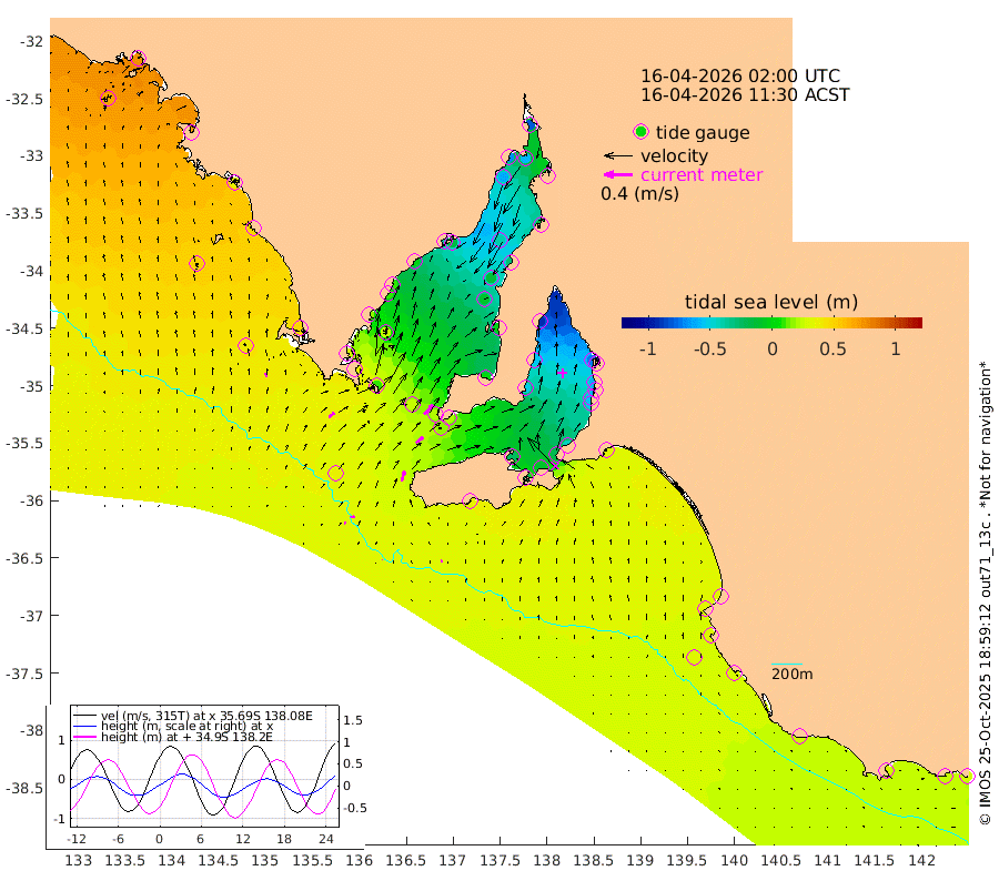 1cm/s 109T +10cm/s rms + 5cm/s 114T. SAM1DS 520m 10cm/s 48T +13cm/s rms + 5cm/s -36T. SAM2CP 100m 6cm/s 80T +21cm/s rms + 18cm/s 142T. SAM3MS 168m 2cm/s 99T +22cm/s rms + 0cm/s -30T. SAM4CY 117m 6cm/s -12T +23cm/s rms + 2cm/s 99T. SAM5CB 94m 13cm/s 52T +8cm/s rms + 3cm/s -172T. SAM6IS 83m 2cm/s 79T +11cm/s rms + 7cm/s 150T. SAM7DS 519m 18cm/s 42T +10cm/s rms + 2cm/s 87T. SAM8SG 47m 15cm/s 18T +20cm/s rms + 12cm/s -168T. NRSKAI 101m 27cm Warrnambool 26cm Port Fairy 28cm Portland 28cm Port Macdonnell 30cm Beachport 32cm Cape Rabelais (off) 31cm Robe 31cm Cape Jaffa 33cm Kingston 30cm Victor Harbor 36cm Vivonne Bay -25cm Kingscote -21cm American River -9cm Penneshaw -21cm Cape Jervis -42cm Second Valley -55cm Port Noarlunga -59cm Port Stanvac -62cm Brighton -64cm Glenelg -75cm Port Adelaide (Outer Harbor) -87cm Angus Inlet (Garden Island) -91cm Ardrossan -53cm Port Vincent -49cm Port Giles 19cm Stenhouse Bay 18cm Althorpe Island 21cm Pondalowie Bay 3cm Point Turton -2cm Port Victoria -10cm Cape Elizabeth -11cm Tiparra Reef Light -29cm Wallaroo -38cm Middle Bank -15cm Port Broughton -61cm Port Pirie -80cm Red Cliff Point (Beacon 5) -60cm Port Bonython -68cm Whyalla -61cm Western Shoal Beacon -36cm Franklin Harbor -17cm Franklin Harbor Entrance Beacon -1cm Arno Bay 9cm Port Neill 11cm Cape Hardy 18cm Tumby Bay 23cm Reevesby Island 30cm Port Lincoln 36cm Taylors Landing 10cm Whalers Bay 26cm Wedge Island Mooring 34cm Shelf Edge Mooring 46cm Coffin Bay Entrance Beacon 40cm Greenly Island 48cm Elliston 52cm Pearson Island 37cm Venus Bay 71cm Blanche Port (Streaky Bay) 72cm Thevenard 64cm St Francis Island