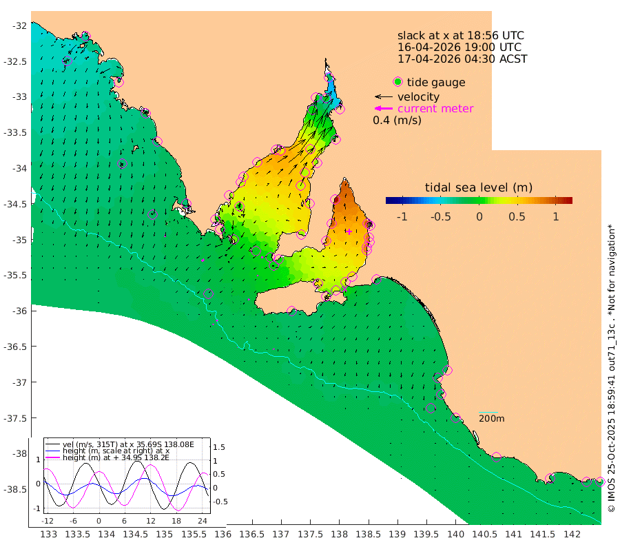 0cm/s 44T +10cm/s rms + 5cm/s 114T. SAM1DS 520m 6cm/s -128T +13cm/s rms + 5cm/s -36T. SAM2CP 100m 3cm/s -33T +21cm/s rms + 18cm/s 142T. SAM3MS 168m 2cm/s 165T +22cm/s rms + 0cm/s -30T. SAM4CY 117m 6cm/s -173T +23cm/s rms + 2cm/s 99T. SAM5CB 94m 2cm/s -144T +8cm/s rms + 3cm/s -172T. SAM6IS 83m 1cm/s -16T +11cm/s rms + 7cm/s 150T. SAM7DS 519m 4cm/s -95T +10cm/s rms + 2cm/s 87T. SAM8SG 47m 3cm/s -158T +20cm/s rms + 12cm/s -168T. NRSKAI 101m -25cm Warrnambool -24cm Port Fairy -24cm Portland -22cm Port Macdonnell -23cm Beachport -24cm Cape Rabelais (off) -23cm Robe -24cm Cape Jaffa -26cm Kingston -20cm Victor Harbor -25cm Vivonne Bay 42cm Kingscote 32cm American River 27cm Penneshaw 33cm Cape Jervis 48cm Second Valley 72cm Port Noarlunga 77cm Port Stanvac 79cm Brighton 82cm Glenelg 92cm Port Adelaide (Outer Harbor) 84cm Angus Inlet (Garden Island) 117cm Ardrossan 90cm Port Vincent 77cm Port Giles 3cm Stenhouse Bay -2cm Althorpe Island -4cm Pondalowie Bay 18cm Point Turton 24cm Port Victoria 25cm Cape Elizabeth 19cm Tiparra Reef Light 17cm Wallaroo 24cm Middle Bank -22cm Port Broughton -25cm Port Pirie -23cm Red Cliff Point (Beacon 5) -5cm Port Bonython 1cm Whyalla 2cm Western Shoal Beacon 31cm Franklin Harbor 35cm Franklin Harbor Entrance Beacon 30cm Arno Bay 27cm Port Neill 21cm Cape Hardy 15cm Tumby Bay 9cm Reevesby Island 3cm Port Lincoln -9cm Taylors Landing 12cm Whalers Bay -5cm Wedge Island Mooring -23cm Shelf Edge Mooring -27cm Coffin Bay Entrance Beacon -25cm Greenly Island -28cm Elliston -28cm Pearson Island -19cm Venus Bay -36cm Blanche Port (Streaky Bay) -37cm Thevenard -36cm St Francis Island