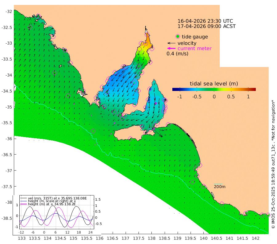 1cm/s 78T +10cm/s rms + 5cm/s 114T. SAM1DS 520m 4cm/s 60T +13cm/s rms + 5cm/s -36T. SAM2CP 100m 3cm/s -158T +21cm/s rms + 18cm/s 142T. SAM3MS 168m 3cm/s 57T +22cm/s rms + 0cm/s -30T. SAM4CY 117m 6cm/s 20T +23cm/s rms + 2cm/s 99T. SAM5CB 94m 8cm/s -122T +8cm/s rms + 3cm/s -172T. SAM6IS 83m 2cm/s -102T +11cm/s rms + 7cm/s 150T. SAM7DS 519m 4cm/s -149T +10cm/s rms + 2cm/s 87T. SAM8SG 47m 5cm/s -164T +20cm/s rms + 12cm/s -168T. NRSKAI 101m 7cm Warrnambool 7cm Port Fairy 6cm Portland 1cm Port Macdonnell 6cm Beachport 5cm Cape Rabelais (off) 3cm Robe -2cm Cape Jaffa -2cm Kingston -3cm Victor Harbor 7cm Vivonne Bay -38cm Kingscote -31cm American River -34cm Penneshaw -29cm Cape Jervis -37cm Second Valley -52cm Port Noarlunga -56cm Port Stanvac -56cm Brighton -61cm Glenelg -63cm Port Adelaide (Outer Harbor) -32cm Angus Inlet (Garden Island) -79cm Ardrossan -84cm Port Vincent -67cm Port Giles -23cm Stenhouse Bay -22cm Althorpe Island -17cm Pondalowie Bay -40cm Point Turton -42cm Port Victoria -43cm Cape Elizabeth -31cm Tiparra Reef Light -14cm Wallaroo -13cm Middle Bank 19cm Port Broughton 72cm Port Pirie 73cm Red Cliff Point (Beacon 5) 61cm Port Bonython 46cm Whyalla 30cm Western Shoal Beacon -37cm Franklin Harbor -52cm Franklin Harbor Entrance Beacon -50cm Arno Bay -58cm Port Neill -49cm Cape Hardy -46cm Tumby Bay -38cm Reevesby Island -36cm Port Lincoln -21cm Taylors Landing -35cm Whalers Bay -19cm Wedge Island Mooring 3cm Shelf Edge Mooring -9cm Coffin Bay Entrance Beacon 1cm Greenly Island -8cm Elliston 3cm Pearson Island -14cm Venus Bay -23cm Blanche Port (Streaky Bay) -19cm Thevenard -1cm St Francis Island