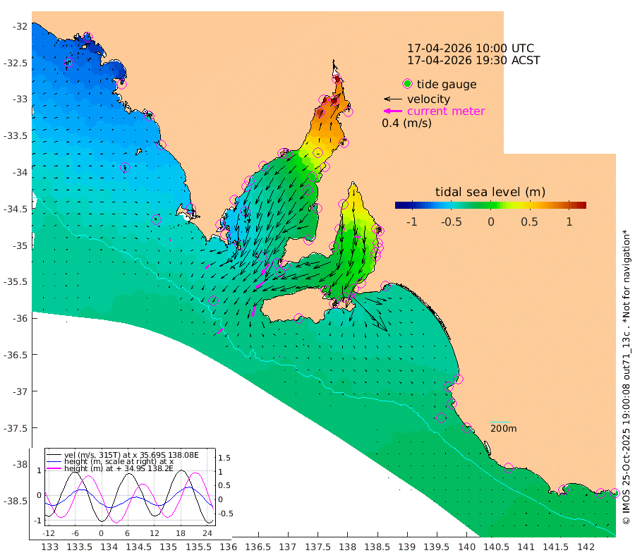 1cm/s -145T +10cm/s rms + 5cm/s 114T. SAM1DS 520m 9cm/s -133T +13cm/s rms + 5cm/s -36T. SAM2CP 100m 9cm/s -128T +21cm/s rms + 18cm/s 142T. SAM3MS 168m 3cm/s -78T +22cm/s rms + 0cm/s -30T. SAM4CY 117m 3cm/s 139T +23cm/s rms + 2cm/s 99T. SAM5CB 94m 22cm/s -128T +8cm/s rms + 3cm/s -172T. SAM6IS 83m 4cm/s -125T +11cm/s rms + 7cm/s 150T. SAM7DS 519m 30cm/s -145T +10cm/s rms + 2cm/s 87T. SAM8SG 47m 23cm/s -164T +20cm/s rms + 12cm/s -168T. NRSKAI 101m -19cm Warrnambool -19cm Port Fairy -22cm Portland -25cm Port Macdonnell -25cm Beachport -28cm Cape Rabelais (off) -28cm Robe -29cm Cape Jaffa -28cm Kingston -30cm Victor Harbor -32cm Vivonne Bay -5cm Kingscote 1cm American River -17cm Penneshaw -1cm Cape Jervis 16cm Second Valley 15cm Port Noarlunga 15cm Port Stanvac 18cm Brighton 16cm Glenelg 25cm Port Adelaide (Outer Harbor) 59cm Angus Inlet (Garden Island) 26cm Ardrossan -5cm Port Vincent -3cm Port Giles -37cm Stenhouse Bay -29cm Althorpe Island -31cm Pondalowie Bay -26cm Point Turton -27cm Port Victoria -16cm Cape Elizabeth -2cm Tiparra Reef Light 30cm Wallaroo 37cm Middle Bank 50cm Port Broughton 137cm Port Pirie 164cm Red Cliff Point (Beacon 5) 120cm Port Bonython 120cm Whyalla 105cm Western Shoal Beacon 25cm Franklin Harbor -16cm Franklin Harbor Entrance Beacon -36cm Arno Bay -48cm Port Neill -46cm Cape Hardy -52cm Tumby Bay -48cm Reevesby Island -57cm Port Lincoln -52cm Taylors Landing -33cm Whalers Bay -39cm Wedge Island Mooring -32cm Shelf Edge Mooring -48cm Coffin Bay Entrance Beacon -40cm Greenly Island -52cm Elliston -53cm Pearson Island -40cm Venus Bay -79cm Blanche Port (Streaky Bay) -79cm Thevenard -63cm St Francis Island