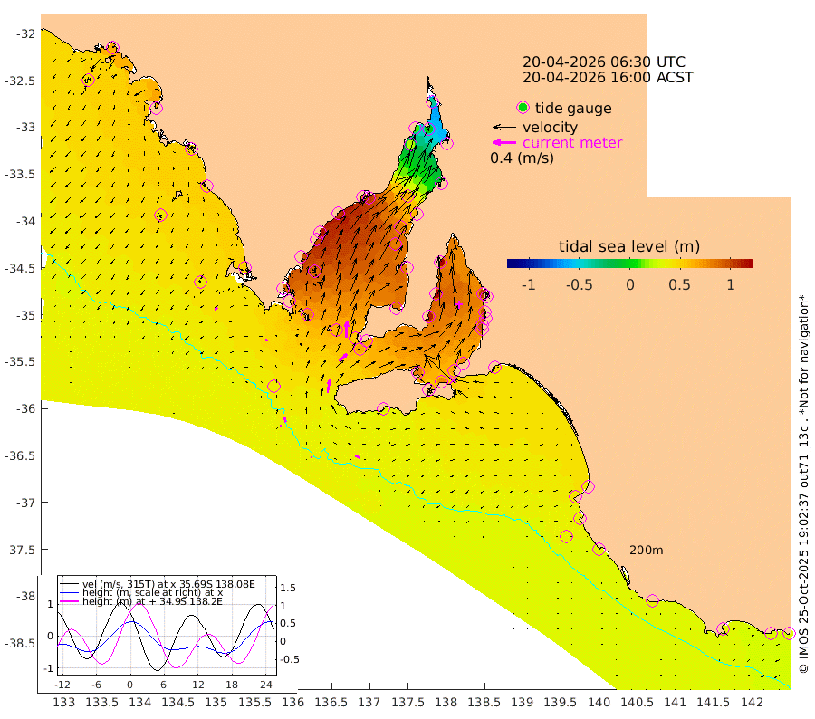 0cm/s -49T +10cm/s rms + 5cm/s 114T. SAM1DS 520m 5cm/s -72T +13cm/s rms + 5cm/s -36T. SAM2CP 100m 8cm/s -19T +21cm/s rms + 18cm/s 142T. SAM3MS 168m 8cm/s -63T +22cm/s rms + 0cm/s -30T. SAM4CY 117m 5cm/s -123T +23cm/s rms + 2cm/s 99T. SAM5CB 94m 18cm/s 45T +8cm/s rms + 3cm/s -172T. SAM6IS 83m 3cm/s 3T +11cm/s rms + 7cm/s 150T. SAM7DS 519m 28cm/s 3T +10cm/s rms + 2cm/s 87T. SAM8SG 47m 22cm/s 10T +20cm/s rms + 12cm/s -168T. NRSKAI 101m 34cm Warrnambool 32cm Port Fairy 34cm Portland 39cm Port Macdonnell 34cm Beachport 37cm Cape Rabelais (off) 37cm Robe 41cm Cape Jaffa 39cm Kingston 46cm Victor Harbor 33cm Vivonne Bay 82cm Kingscote 69cm American River 77cm Penneshaw 67cm Cape Jervis 76cm Second Valley 93cm Port Noarlunga 97cm Port Stanvac 96cm Brighton 101cm Glenelg 103cm Port Adelaide (Outer Harbor) 73cm Angus Inlet (Garden Island) 123cm Ardrossan 123cm Port Vincent 110cm Port Giles 65cm Stenhouse Bay 64cm Althorpe Island 55cm Pondalowie Bay 84cm Point Turton 82cm Port Victoria 82cm Cape Elizabeth 80cm Tiparra Reef Light 62cm Wallaroo 65cm Middle Bank -6cm Port Broughton -22cm Port Pirie -36cm Red Cliff Point (Beacon 5) -2cm Port Bonython 10cm Whyalla 21cm Western Shoal Beacon 73cm Franklin Harbor 104cm Franklin Harbor Entrance Beacon 103cm Arno Bay 114cm Port Neill 101cm Cape Hardy 97cm Tumby Bay 89cm Reevesby Island 86cm Port Lincoln 67cm Taylors Landing 77cm Whalers Bay 64cm Wedge Island Mooring 39cm Shelf Edge Mooring 51cm Coffin Bay Entrance Beacon 38cm Greenly Island 49cm Elliston 40cm Pearson Island 47cm Venus Bay 65cm Blanche Port (Streaky Bay) 60cm Thevenard 42cm St Francis Island