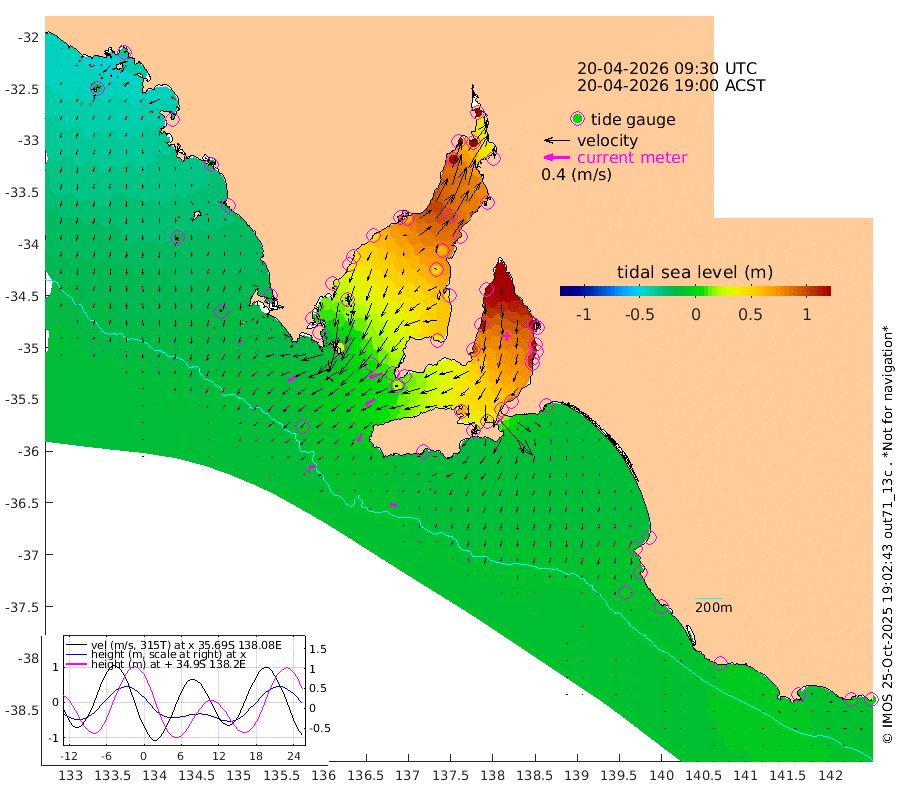 1cm/s -137T +10cm/s rms + 5cm/s 114T. SAM1DS 520m 14cm/s -120T +13cm/s rms + 5cm/s -36T. SAM2CP 100m 10cm/s -99T +21cm/s rms + 18cm/s 142T. SAM3MS 168m 10cm/s -80T +22cm/s rms + 0cm/s -30T. SAM4CY 117m 5cm/s -162T +23cm/s rms + 2cm/s 99T. SAM5CB 94m 17cm/s -121T +8cm/s rms + 3cm/s -172T. SAM6IS 83m 3cm/s -100T +11cm/s rms + 7cm/s 150T. SAM7DS 519m 20cm/s -109T +10cm/s rms + 2cm/s 87T. SAM8SG 47m 13cm/s -157T +20cm/s rms + 12cm/s -168T. NRSKAI 101m -4cm Warrnambool -4cm Port Fairy -4cm Portland -2cm Port Macdonnell -6cm Beachport -6cm Cape Rabelais (off) -7cm Robe -4cm Cape Jaffa -5cm Kingston -2cm Victor Harbor -14cm Vivonne Bay 67cm Kingscote 64cm American River 46cm Penneshaw 59cm Cape Jervis 86cm Second Valley 104cm Port Noarlunga 108cm Port Stanvac 111cm Brighton 114cm Glenelg 126cm Port Adelaide (Outer Harbor) 143cm Angus Inlet (Garden Island) 147cm Ardrossan 114cm Port Vincent 96cm Port Giles 12cm Stenhouse Bay 19cm Althorpe Island 10cm Pondalowie Bay 39cm Point Turton 40cm Port Victoria 50cm Cape Elizabeth 64cm Tiparra Reef Light 87cm Wallaroo 96cm Middle Bank 58cm Port Broughton 137cm Port Pirie 153cm Red Cliff Point (Beacon 5) 139cm Port Bonython 144cm Whyalla 135cm Western Shoal Beacon 86cm Franklin Harbor 65cm Franklin Harbor Entrance Beacon 45cm Arno Bay 40cm Port Neill 30cm Cape Hardy 20cm Tumby Bay 20cm Reevesby Island 5cm Port Lincoln -5cm Taylors Landing 28cm Whalers Bay 7cm Wedge Island Mooring -7cm Shelf Edge Mooring -14cm Coffin Bay Entrance Beacon -16cm Greenly Island -19cm Elliston -22cm Pearson Island -7cm Venus Bay -33cm Blanche Port (Streaky Bay) -37cm Thevenard -29cm St Francis Island