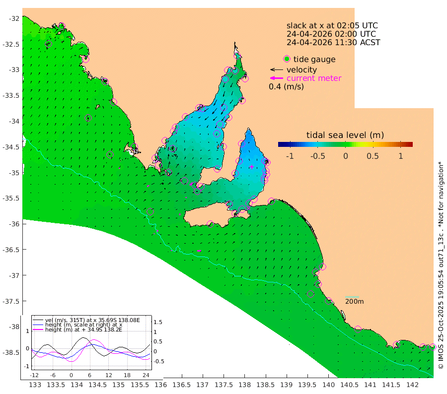 2cm/s 119T +10cm/s rms + 5cm/s 114T. SAM1DS 520m 6cm/s 52T +13cm/s rms + 5cm/s -36T. SAM2CP 100m 5cm/s 58T +21cm/s rms + 18cm/s 142T. SAM3MS 168m 11cm/s 86T +22cm/s rms + 0cm/s -30T. SAM4CY 117m 3cm/s 22T +23cm/s rms + 2cm/s 99T. SAM5CB 94m 2cm/s 10T +8cm/s rms + 3cm/s -172T. SAM6IS 83m 2cm/s 48T +11cm/s rms + 7cm/s 150T. SAM7DS 519m 11cm/s 46T +10cm/s rms + 2cm/s 87T. SAM8SG 47m 5cm/s 18T +20cm/s rms + 12cm/s -168T. NRSKAI 101m -12cm Warrnambool -11cm Port Fairy -11cm Portland -15cm Port Macdonnell -9cm Beachport -10cm Cape Rabelais (off) -12cm Robe -15cm Cape Jaffa -12cm Kingston -11cm Victor Harbor -1cm Vivonne Bay -41cm Kingscote -37cm American River -33cm Penneshaw -33cm Cape Jervis -44cm Second Valley -50cm Port Noarlunga -53cm Port Stanvac -54cm Brighton -57cm Glenelg -59cm Port Adelaide (Outer Harbor) -55cm Angus Inlet (Garden Island) -68cm Ardrossan -60cm Port Vincent -54cm Port Giles -23cm Stenhouse Bay -23cm Althorpe Island -21cm Pondalowie Bay -38cm Point Turton -40cm Port Victoria -41cm Cape Elizabeth -43cm Tiparra Reef Light -48cm Wallaroo -50cm Middle Bank -46cm Port Broughton -46cm Port Pirie -39cm Red Cliff Point (Beacon 5) -44cm Port Bonython -51cm Whyalla -47cm Western Shoal Beacon -52cm Franklin Harbor -44cm Franklin Harbor Entrance Beacon -37cm Arno Bay -37cm Port Neill -31cm Cape Hardy -27cm Tumby Bay -22cm Reevesby Island -21cm Port Lincoln -13cm Taylors Landing -31cm Whalers Bay -19cm Wedge Island Mooring -7cm Shelf Edge Mooring -6cm Coffin Bay Entrance Beacon -2cm Greenly Island -5cm Elliston -1cm Pearson Island -11cm Venus Bay -4cm Blanche Port (Streaky Bay) 1cm Thevenard 5cm St Francis Island