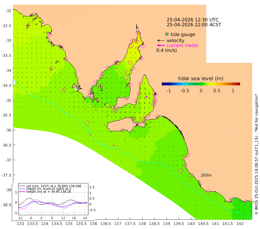 1cm/s -80T +10cm/s rms + 5cm/s 114T. SAM1DS 520m 3cm/s -108T +13cm/s rms + 5cm/s -36T. SAM2CP 100m 5cm/s -99T +21cm/s rms + 18cm/s 142T. SAM3MS 168m 8cm/s -66T +22cm/s rms + 0cm/s -30T. SAM4CY 117m 1cm/s -30T +23cm/s rms + 2cm/s 99T. SAM5CB 94m 5cm/s -95T +8cm/s rms + 3cm/s -172T. SAM6IS 83m 2cm/s -111T +11cm/s rms + 7cm/s 150T. SAM7DS 519m 9cm/s -38T +10cm/s rms + 2cm/s 87T. SAM8SG 47m 2cm/s -24T +20cm/s rms + 12cm/s -168T. NRSKAI 101m 12cm Warrnambool 14cm Port Fairy 15cm Portland 18cm Port Macdonnell 17cm Beachport 18cm Cape Rabelais (off) 17cm Robe 22cm Cape Jaffa 19cm Kingston 20cm Victor Harbor 15cm Vivonne Bay 22cm Kingscote 25cm American River 22cm Penneshaw 22cm Cape Jervis 25cm Second Valley 23cm Port Noarlunga 23cm Port Stanvac 25cm Brighton 25cm Glenelg 25cm Port Adelaide (Outer Harbor) 29cm Angus Inlet (Garden Island) 23cm Ardrossan 31cm Port Vincent 20cm Port Giles 16cm Stenhouse Bay 20cm Althorpe Island 19cm Pondalowie Bay 21cm Point Turton 26cm Port Victoria 29cm Cape Elizabeth 26cm Tiparra Reef Light 35cm Wallaroo 38cm Middle Bank 36cm Port Broughton 61cm Port Pirie 64cm Red Cliff Point (Beacon 5) 56cm Port Bonython 55cm Whyalla 50cm Western Shoal Beacon 31cm Franklin Harbor 27cm Franklin Harbor Entrance Beacon 24cm Arno Bay 22cm Port Neill 23cm Cape Hardy 23cm Tumby Bay 22cm Reevesby Island 19cm Port Lincoln 19cm Taylors Landing 21cm Whalers Bay 22cm Wedge Island Mooring 21cm Shelf Edge Mooring 23cm Coffin Bay Entrance Beacon 20cm Greenly Island 24cm Elliston 24cm Pearson Island 19cm Venus Bay 28cm Blanche Port (Streaky Bay) 26cm Thevenard 18cm St Francis Island