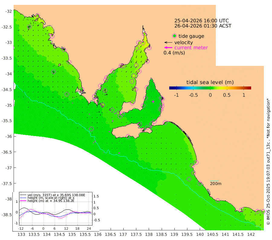 1cm/s -83T +10cm/s rms + 5cm/s 114T. SAM1DS 520m 3cm/s -156T +13cm/s rms + 5cm/s -36T. SAM2CP 100m 5cm/s -159T +21cm/s rms + 18cm/s 142T. SAM3MS 168m 8cm/s -103T +22cm/s rms + 0cm/s -30T. SAM4CY 117m 2cm/s -176T +23cm/s rms + 2cm/s 99T. SAM5CB 94m 5cm/s -133T +8cm/s rms + 3cm/s -172T. SAM6IS 83m 3cm/s -174T +11cm/s rms + 7cm/s 150T. SAM7DS 519m 6cm/s -147T +10cm/s rms + 2cm/s 87T. SAM8SG 47m 5cm/s -172T +20cm/s rms + 12cm/s -168T. NRSKAI 101m 13cm Warrnambool 12cm Port Fairy 12cm Portland 11cm Port Macdonnell 9cm Beachport 10cm Cape Rabelais (off) 12cm Robe 13cm Cape Jaffa 11cm Kingston 8cm Victor Harbor 3cm Vivonne Bay 5cm Kingscote 5cm American River 5cm Penneshaw 5cm Cape Jervis 0cm Second Valley 0cm Port Noarlunga 1cm Port Stanvac 0cm Brighton 1cm Glenelg -1cm Port Adelaide (Outer Harbor) 0cm Angus Inlet (Garden Island) -5cm Ardrossan -3cm Port Vincent 1cm Port Giles 9cm Stenhouse Bay 10cm Althorpe Island 12cm Pondalowie Bay 19cm Point Turton 23cm Port Victoria 19cm Cape Elizabeth 19cm Tiparra Reef Light 22cm Wallaroo 21cm Middle Bank 30cm Port Broughton 23cm Port Pirie 16cm Red Cliff Point (Beacon 5) 19cm Port Bonython 20cm Whyalla 18cm Western Shoal Beacon 19cm Franklin Harbor 15cm Franklin Harbor Entrance Beacon 15cm Arno Bay 13cm Port Neill 12cm Cape Hardy 11cm Tumby Bay 13cm Reevesby Island 12cm Port Lincoln 9cm Taylors Landing 15cm Whalers Bay 11cm Wedge Island Mooring 6cm Shelf Edge Mooring 11cm Coffin Bay Entrance Beacon 8cm Greenly Island 10cm Elliston 7cm Pearson Island 12cm Venus Bay 17cm Blanche Port (Streaky Bay) 15cm Thevenard 11cm St Francis Island