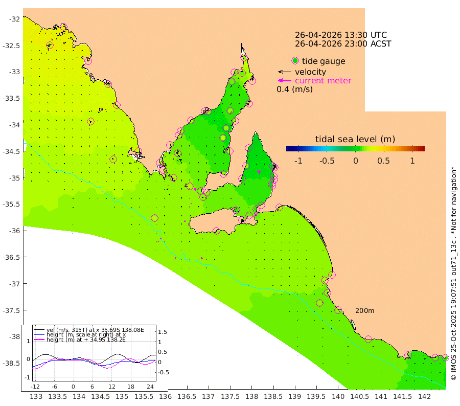 1cm/s -73T +10cm/s rms + 5cm/s 114T. SAM1DS 520m 0cm/s -63T +13cm/s rms + 5cm/s -36T. SAM2CP 100m 3cm/s -108T +21cm/s rms + 18cm/s 142T. SAM3MS 168m 6cm/s -71T +22cm/s rms + 0cm/s -30T. SAM4CY 117m 1cm/s -25T +23cm/s rms + 2cm/s 99T. SAM5CB 94m 2cm/s -49T +8cm/s rms + 3cm/s -172T. SAM6IS 83m 1cm/s -137T +11cm/s rms + 7cm/s 150T. SAM7DS 519m 7cm/s -9T +10cm/s rms + 2cm/s 87T. SAM8SG 47m 4cm/s 7T +20cm/s rms + 12cm/s -168T. NRSKAI 101m 10cm Warrnambool 12cm Port Fairy 13cm Portland 17cm Port Macdonnell 16cm Beachport 17cm Cape Rabelais (off) 16cm Robe 21cm Cape Jaffa 19cm Kingston 19cm Victor Harbor 15cm Vivonne Bay 11cm Kingscote 14cm American River 14cm Penneshaw 11cm Cape Jervis 8cm Second Valley 6cm Port Noarlunga 6cm Port Stanvac 5cm Brighton 6cm Glenelg 3cm Port Adelaide (Outer Harbor) 0cm Angus Inlet (Garden Island) 0cm Ardrossan 17cm Port Vincent 7cm Port Giles 15cm Stenhouse Bay 17cm Althorpe Island 19cm Pondalowie Bay 17cm Point Turton 22cm Port Victoria 24cm Cape Elizabeth 15cm Tiparra Reef Light 17cm Wallaroo 17cm Middle Bank 22cm Port Broughton 17cm Port Pirie 16cm Red Cliff Point (Beacon 5) 15cm Port Bonython 14cm Whyalla 13cm Western Shoal Beacon 15cm Franklin Harbor 18cm Franklin Harbor Entrance Beacon 20cm Arno Bay 20cm Port Neill 22cm Cape Hardy 23cm Tumby Bay 22cm Reevesby Island 22cm Port Lincoln 22cm Taylors Landing 19cm Whalers Bay 21cm Wedge Island Mooring 20cm Shelf Edge Mooring 26cm Coffin Bay Entrance Beacon 22cm Greenly Island 27cm Elliston 27cm Pearson Island 22cm Venus Bay 38cm Blanche Port (Streaky Bay) 36cm Thevenard 24cm St Francis Island