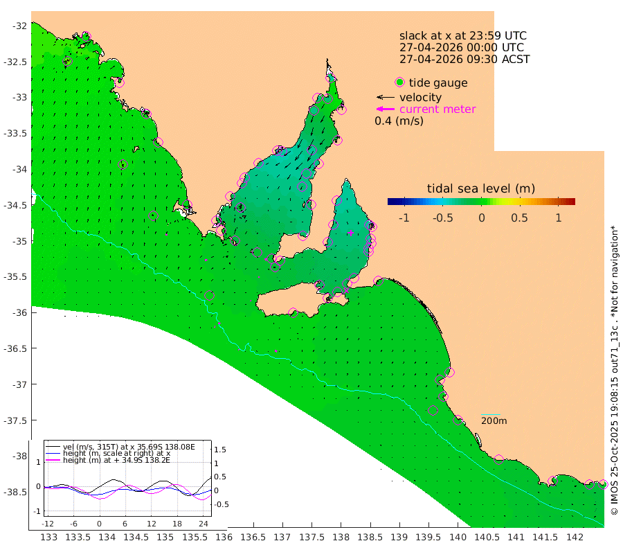 1cm/s 105T +10cm/s rms + 5cm/s 114T. SAM1DS 520m 4cm/s 55T +13cm/s rms + 5cm/s -36T. SAM2CP 100m 4cm/s 110T +21cm/s rms + 18cm/s 142T. SAM3MS 168m 5cm/s 118T +22cm/s rms + 0cm/s -30T. SAM4CY 117m 3cm/s 4T +23cm/s rms + 2cm/s 99T. SAM5CB 94m 2cm/s -153T +8cm/s rms + 3cm/s -172T. SAM6IS 83m 1cm/s 109T +11cm/s rms + 7cm/s 150T. SAM7DS 519m 5cm/s 125T +10cm/s rms + 2cm/s 87T. SAM8SG 47m 2cm/s 162T +20cm/s rms + 12cm/s -168T. NRSKAI 101m -10cm Warrnambool -8cm Port Fairy -7cm Portland -5cm Port Macdonnell -4cm Beachport -5cm Cape Rabelais (off) -4cm Robe -6cm Cape Jaffa -7cm Kingston -6cm Victor Harbor 2cm Vivonne Bay -23cm Kingscote -18cm American River -19cm Penneshaw -19cm Cape Jervis -25cm Second Valley -30cm Port Noarlunga -32cm Port Stanvac -32cm Brighton -35cm Glenelg -36cm Port Adelaide (Outer Harbor) -35cm Angus Inlet (Garden Island) -41cm Ardrossan -30cm Port Vincent -32cm Port Giles -9cm Stenhouse Bay -12cm Althorpe Island -8cm Pondalowie Bay -23cm Point Turton -25cm Port Victoria -28cm Cape Elizabeth -28cm Tiparra Reef Light -30cm Wallaroo -34cm Middle Bank -11cm Port Broughton -25cm Port Pirie -34cm Red Cliff Point (Beacon 5) -30cm Port Bonython -33cm Whyalla -31cm Western Shoal Beacon -35cm Franklin Harbor -36cm Franklin Harbor Entrance Beacon -28cm Arno Bay -31cm Port Neill -23cm Cape Hardy -20cm Tumby Bay -14cm Reevesby Island -13cm Port Lincoln -7cm Taylors Landing -16cm Whalers Bay -9cm Wedge Island Mooring -1cm Shelf Edge Mooring -1cm Coffin Bay Entrance Beacon 2cm Greenly Island 2cm Elliston 8cm Pearson Island -1cm Venus Bay 5cm Blanche Port (Streaky Bay) 6cm Thevenard 13cm St Francis Island