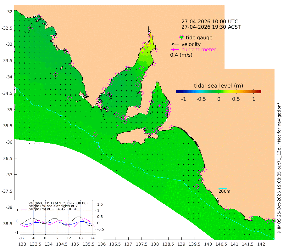 0cm/s -101T +10cm/s rms + 5cm/s 114T. SAM1DS 520m 1cm/s -109T +13cm/s rms + 5cm/s -36T. SAM2CP 100m 3cm/s -77T +21cm/s rms + 18cm/s 142T. SAM3MS 168m 4cm/s -28T +22cm/s rms + 0cm/s -30T. SAM4CY 117m 1cm/s 30T +23cm/s rms + 2cm/s 99T. SAM5CB 94m 1cm/s -89T +8cm/s rms + 3cm/s -172T. SAM6IS 83m 2cm/s -72T +11cm/s rms + 7cm/s 150T. SAM7DS 519m 3cm/s -100T +10cm/s rms + 2cm/s 87T. SAM8SG 47m 1cm/s -92T +20cm/s rms + 12cm/s -168T. NRSKAI 101m 5cm Warrnambool 5cm Port Fairy 4cm Portland 3cm Port Macdonnell 4cm Beachport 4cm Cape Rabelais (off) 1cm Robe 3cm Cape Jaffa 4cm Kingston 2cm Victor Harbor 2cm Vivonne Bay -4cm Kingscote -1cm American River -2cm Penneshaw -2cm Cape Jervis 2cm Second Valley -6cm Port Noarlunga -7cm Port Stanvac -5cm Brighton -6cm Glenelg -7cm Port Adelaide (Outer Harbor) 2cm Angus Inlet (Garden Island) -11cm Ardrossan -13cm Port Vincent -11cm Port Giles -6cm Stenhouse Bay -2cm Althorpe Island -5cm Pondalowie Bay -10cm Point Turton -11cm Port Victoria -5cm Cape Elizabeth -3cm Tiparra Reef Light 6cm Wallaroo 8cm Middle Bank 17cm Port Broughton 45cm Port Pirie 59cm Red Cliff Point (Beacon 5) 38cm Port Bonython 36cm Whyalla 30cm Western Shoal Beacon 2cm Franklin Harbor -7cm Franklin Harbor Entrance Beacon -12cm Arno Bay -10cm Port Neill -11cm Cape Hardy -10cm Tumby Bay -14cm Reevesby Island -12cm Port Lincoln -7cm Taylors Landing -10cm Whalers Bay -5cm Wedge Island Mooring 2cm Shelf Edge Mooring -4cm Coffin Bay Entrance Beacon -2cm Greenly Island -5cm Elliston -4cm Pearson Island -6cm Venus Bay -14cm Blanche Port (Streaky Bay) -15cm Thevenard -7cm St Francis Island