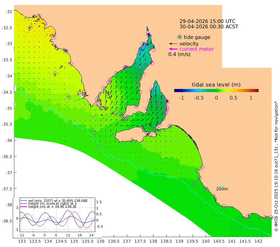 1cm/s -58T +10cm/s rms + 5cm/s 114T. SAM1DS 520m 5cm/s 65T +13cm/s rms + 5cm/s -36T. SAM2CP 100m 4cm/s 90T +21cm/s rms + 18cm/s 142T. SAM3MS 168m 2cm/s -170T +22cm/s rms + 0cm/s -30T. SAM4CY 117m 1cm/s -56T +23cm/s rms + 2cm/s 99T. SAM5CB 94m 9cm/s 56T +8cm/s rms + 3cm/s -172T. SAM6IS 83m 2cm/s 105T +11cm/s rms + 7cm/s 150T. SAM7DS 519m 9cm/s 64T +10cm/s rms + 2cm/s 87T. SAM8SG 47m 7cm/s 22T +20cm/s rms + 12cm/s -168T. NRSKAI 101m -2cm Warrnambool 0cm Port Fairy 1cm Portland 4cm Port Macdonnell 4cm Beachport 6cm Cape Rabelais (off) 6cm Robe 9cm Cape Jaffa 9cm Kingston 7cm Victor Harbor 6cm Vivonne Bay -8cm Kingscote -8cm American River 0cm Penneshaw -9cm Cape Jervis -20cm Second Valley -20cm Port Noarlunga -20cm Port Stanvac -22cm Brighton -20cm Glenelg -26cm Port Adelaide (Outer Harbor) -49cm Angus Inlet (Garden Island) -27cm Ardrossan 0cm Port Vincent -9cm Port Giles 10cm Stenhouse Bay 7cm Althorpe Island 11cm Pondalowie Bay 6cm Point Turton 9cm Port Victoria 6cm Cape Elizabeth -10cm Tiparra Reef Light -28cm Wallaroo -34cm Middle Bank -17cm Port Broughton -89cm Port Pirie -100cm Red Cliff Point (Beacon 5) -83cm Port Bonython -83cm Whyalla -74cm Western Shoal Beacon -22cm Franklin Harbor -6cm Franklin Harbor Entrance Beacon 7cm Arno Bay 14cm Port Neill 16cm Cape Hardy 20cm Tumby Bay 15cm Reevesby Island 20cm Port Lincoln 18cm Taylors Landing 10cm Whalers Bay 12cm Wedge Island Mooring 8cm Shelf Edge Mooring 19cm Coffin Bay Entrance Beacon 13cm Greenly Island 21cm Elliston 22cm Pearson Island 18cm Venus Bay 41cm Blanche Port (Streaky Bay) 38cm Thevenard 24cm St Francis Island