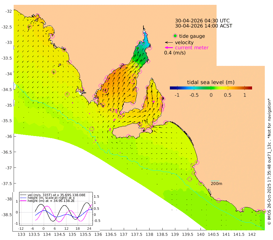 0cm/s 108T +10cm/s rms + 5cm/s 114T. SAM1DS 520m 3cm/s -59T +13cm/s rms + 5cm/s -36T. SAM2CP 100m 5cm/s -2T +21cm/s rms + 18cm/s 142T. SAM3MS 168m 2cm/s -64T +22cm/s rms + 0cm/s -30T. SAM4CY 117m 4cm/s -125T +23cm/s rms + 2cm/s 99T. SAM5CB 94m 12cm/s 45T +8cm/s rms + 3cm/s -172T. SAM6IS 83m 2cm/s 20T +11cm/s rms + 7cm/s 150T. SAM7DS 519m 19cm/s 8T +10cm/s rms + 2cm/s 87T. SAM8SG 47m 15cm/s 11T +20cm/s rms + 12cm/s -168T. NRSKAI 101m 18cm Warrnambool 18cm Port Fairy 19cm Portland 23cm Port Macdonnell 19cm Beachport 20cm Cape Rabelais (off) 23cm Robe 26cm Cape Jaffa 23cm Kingston 28cm Victor Harbor 20cm Vivonne Bay 51cm Kingscote 42cm American River 47cm Penneshaw 41cm Cape Jervis 45cm Second Valley 57cm Port Noarlunga 59cm Port Stanvac 57cm Brighton 59cm Glenelg 62cm Port Adelaide (Outer Harbor) 34cm Angus Inlet (Garden Island) 75cm Ardrossan 80cm Port Vincent 70cm Port Giles 42cm Stenhouse Bay 40cm Althorpe Island 35cm Pondalowie Bay 56cm Point Turton 54cm Port Victoria 54cm Cape Elizabeth 50cm Tiparra Reef Light 33cm Wallaroo 33cm Middle Bank -17cm Port Broughton -41cm Port Pirie -54cm Red Cliff Point (Beacon 5) -32cm Port Bonython -18cm Whyalla -3cm Western Shoal Beacon 45cm Franklin Harbor 68cm Franklin Harbor Entrance Beacon 69cm Arno Bay 73cm Port Neill 70cm Cape Hardy 67cm Tumby Bay 65cm Reevesby Island 61cm Port Lincoln 46cm Taylors Landing 52cm Whalers Bay 42cm Wedge Island Mooring 24cm Shelf Edge Mooring 35cm Coffin Bay Entrance Beacon 26cm Greenly Island 35cm Elliston 26cm Pearson Island 34cm Venus Bay 52cm Blanche Port (Streaky Bay) 49cm Thevenard 34cm St Francis Island