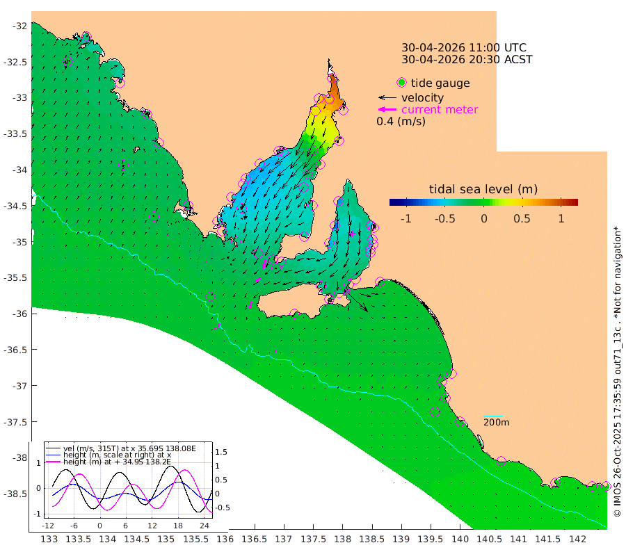1cm/s -110T +10cm/s rms + 5cm/s 114T. SAM1DS 520m 3cm/s 179T +13cm/s rms + 5cm/s -36T. SAM2CP 100m 7cm/s -166T +21cm/s rms + 18cm/s 142T. SAM3MS 168m 3cm/s -81T +22cm/s rms + 0cm/s -30T. SAM4CY 117m 3cm/s 45T +23cm/s rms + 2cm/s 99T. SAM5CB 94m 13cm/s -133T +8cm/s rms + 3cm/s -172T. SAM6IS 83m 3cm/s -157T +11cm/s rms + 7cm/s 150T. SAM7DS 519m 21cm/s -161T +10cm/s rms + 2cm/s 87T. SAM8SG 47m 15cm/s -167T +20cm/s rms + 12cm/s -168T. NRSKAI 101m 0cm Warrnambool -1cm Port Fairy -2cm Portland -5cm Port Macdonnell -6cm Beachport -5cm Cape Rabelais (off) -7cm Robe -7cm Cape Jaffa -5cm Kingston -12cm Victor Harbor -9cm Vivonne Bay -39cm Kingscote -28cm American River -34cm Penneshaw -28cm Cape Jervis -30cm Second Valley -48cm Port Noarlunga -50cm Port Stanvac -48cm Brighton -52cm Glenelg -55cm Port Adelaide (Outer Harbor) -29cm Angus Inlet (Garden Island) -70cm Ardrossan -75cm Port Vincent -61cm Port Giles -29cm Stenhouse Bay -20cm Althorpe Island -22cm Pondalowie Bay -37cm Point Turton -37cm Port Victoria -35cm Cape Elizabeth -24cm Tiparra Reef Light -4cm Wallaroo -6cm Middle Bank 48cm Port Broughton 82cm Port Pirie 97cm Red Cliff Point (Beacon 5) 58cm Port Bonython 54cm Whyalla 44cm Western Shoal Beacon -21cm Franklin Harbor -46cm Franklin Harbor Entrance Beacon -51cm Arno Bay -54cm Port Neill -49cm Cape Hardy -48cm Tumby Bay -47cm Reevesby Island -44cm Port Lincoln -33cm Taylors Landing -33cm Whalers Bay -27cm Wedge Island Mooring -11cm Shelf Edge Mooring -19cm Coffin Bay Entrance Beacon -14cm Greenly Island -17cm Elliston -15cm Pearson Island -17cm Venus Bay -30cm Blanche Port (Streaky Bay) -30cm Thevenard -10cm St Francis Island