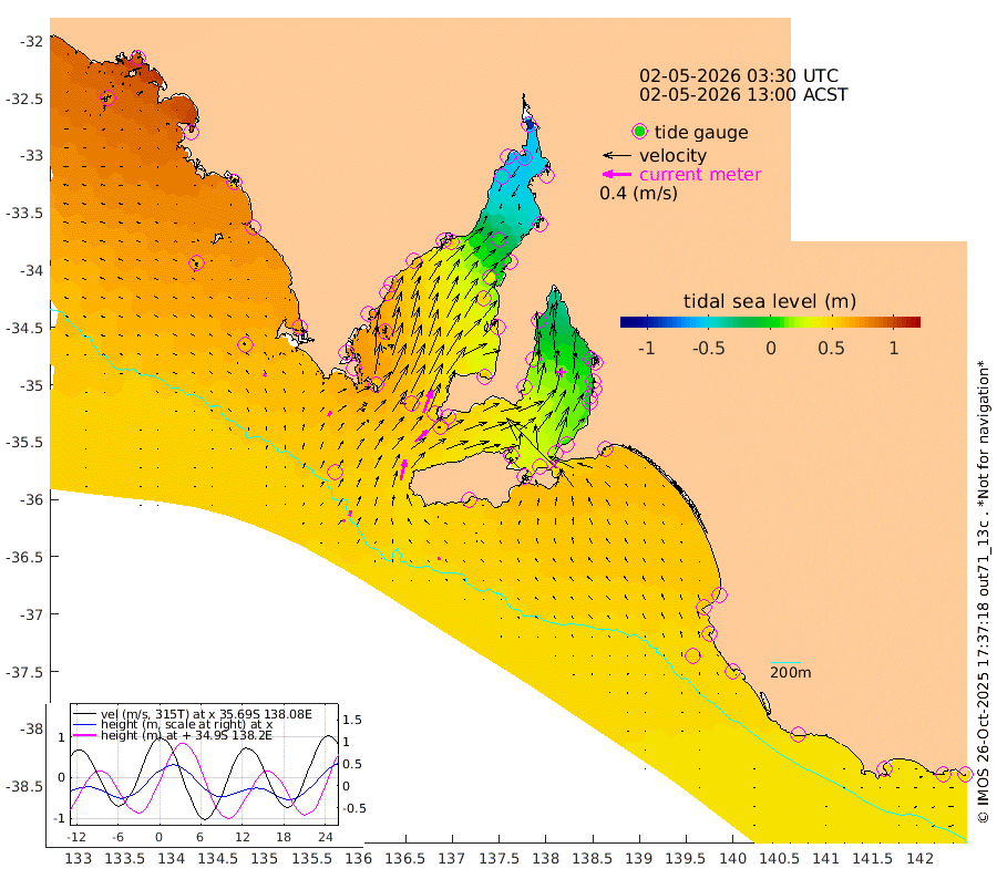 0cm/s 80T +10cm/s rms + 5cm/s 114T. SAM1DS 520m 8cm/s 28T +13cm/s rms + 5cm/s -36T. SAM2CP 100m 8cm/s 16T +21cm/s rms + 18cm/s 142T. SAM3MS 168m 4cm/s -25T +22cm/s rms + 0cm/s -30T. SAM4CY 117m 4cm/s -50T +23cm/s rms + 2cm/s 99T. SAM5CB 94m 24cm/s 48T +8cm/s rms + 3cm/s -172T. SAM6IS 83m 4cm/s 22T +11cm/s rms + 7cm/s 150T. SAM7DS 519m 35cm/s 20T +10cm/s rms + 2cm/s 87T. SAM8SG 47m 29cm/s 13T +20cm/s rms + 12cm/s -168T. NRSKAI 101m 46cm Warrnambool 46cm Port Fairy 47cm Portland 48cm Port Macdonnell 48cm Beachport 49cm Cape Rabelais (off) 50cm Robe 53cm Cape Jaffa 52cm Kingston 55cm Victor Harbor 51cm Vivonne Bay 28cm Kingscote 22cm American River 39cm Penneshaw 21cm Cape Jervis 9cm Second Valley 7cm Port Noarlunga 6cm Port Stanvac 2cm Brighton 2cm Glenelg -4cm Port Adelaide (Outer Harbor) -37cm Angus Inlet (Garden Island) -8cm Ardrossan 26cm Port Vincent 23cm Port Giles 53cm Stenhouse Bay 51cm Althorpe Island 48cm Pondalowie Bay 53cm Point Turton 48cm Port Victoria 45cm Cape Elizabeth 36cm Tiparra Reef Light 10cm Wallaroo 7cm Middle Bank -32cm Port Broughton -73cm Port Pirie -92cm Red Cliff Point (Beacon 5) -62cm Port Bonython -57cm Whyalla -45cm Western Shoal Beacon 19cm Franklin Harbor 53cm Franklin Harbor Entrance Beacon 63cm Arno Bay 75cm Port Neill 71cm Cape Hardy 75cm Tumby Bay 74cm Reevesby Island 78cm Port Lincoln 71cm Taylors Landing 54cm Whalers Bay 60cm Wedge Island Mooring 52cm Shelf Edge Mooring 68cm Coffin Bay Entrance Beacon 58cm Greenly Island 68cm Elliston 63cm Pearson Island 56cm Venus Bay 95cm Blanche Port (Streaky Bay) 93cm Thevenard 78cm St Francis Island