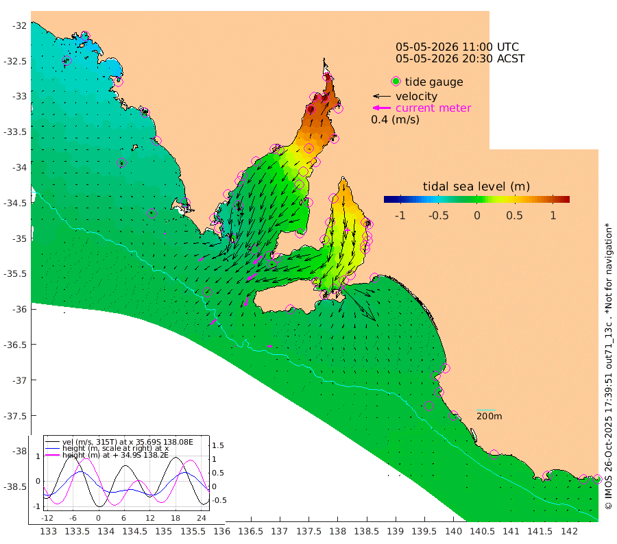 1cm/s -119T +10cm/s rms + 5cm/s 114T. SAM1DS 520m 11cm/s -128T +13cm/s rms + 5cm/s -36T. SAM2CP 100m 12cm/s -125T +21cm/s rms + 18cm/s 142T. SAM3MS 168m 10cm/s -86T +22cm/s rms + 0cm/s -30T. SAM4CY 117m 2cm/s 165T +23cm/s rms + 2cm/s 99T. SAM5CB 94m 25cm/s -123T +8cm/s rms + 3cm/s -172T. SAM6IS 83m 5cm/s -129T +11cm/s rms + 7cm/s 150T. SAM7DS 519m 26cm/s -133T +10cm/s rms + 2cm/s 87T. SAM8SG 47m 20cm/s -163T +20cm/s rms + 12cm/s -168T. NRSKAI 101m -4cm Warrnambool -3cm Port Fairy -5cm Portland -4cm Port Macdonnell -8cm Beachport -9cm Cape Rabelais (off) -9cm Robe -6cm Cape Jaffa -8cm Kingston -10cm Victor Harbor -16cm Vivonne Bay 19cm Kingscote 24cm American River 6cm Penneshaw 19cm Cape Jervis 37cm Second Valley 38cm Port Noarlunga 39cm Port Stanvac 41cm Brighton 40cm Glenelg 49cm Port Adelaide (Outer Harbor) 79cm Angus Inlet (Garden Island) 50cm Ardrossan 30cm Port Vincent 22cm Port Giles -14cm Stenhouse Bay -6cm Althorpe Island -7cm Pondalowie Bay 4cm Point Turton 6cm Port Victoria 17cm Cape Elizabeth 27cm Tiparra Reef Light 60cm Wallaroo 66cm Middle Bank 76cm Port Broughton 160cm Port Pirie 177cm Red Cliff Point (Beacon 5) 144cm Port Bonython 143cm Whyalla 127cm Western Shoal Beacon 53cm Franklin Harbor 16cm Franklin Harbor Entrance Beacon -4cm Arno Bay -16cm Port Neill -15cm Cape Hardy -21cm Tumby Bay -17cm Reevesby Island -28cm Port Lincoln -26cm Taylors Landing -5cm Whalers Bay -13cm Wedge Island Mooring -11cm Shelf Edge Mooring -21cm Coffin Bay Entrance Beacon -18cm Greenly Island -25cm Elliston -26cm Pearson Island -16cm Venus Bay -42cm Blanche Port (Streaky Bay) -44cm Thevenard -39cm St Francis Island