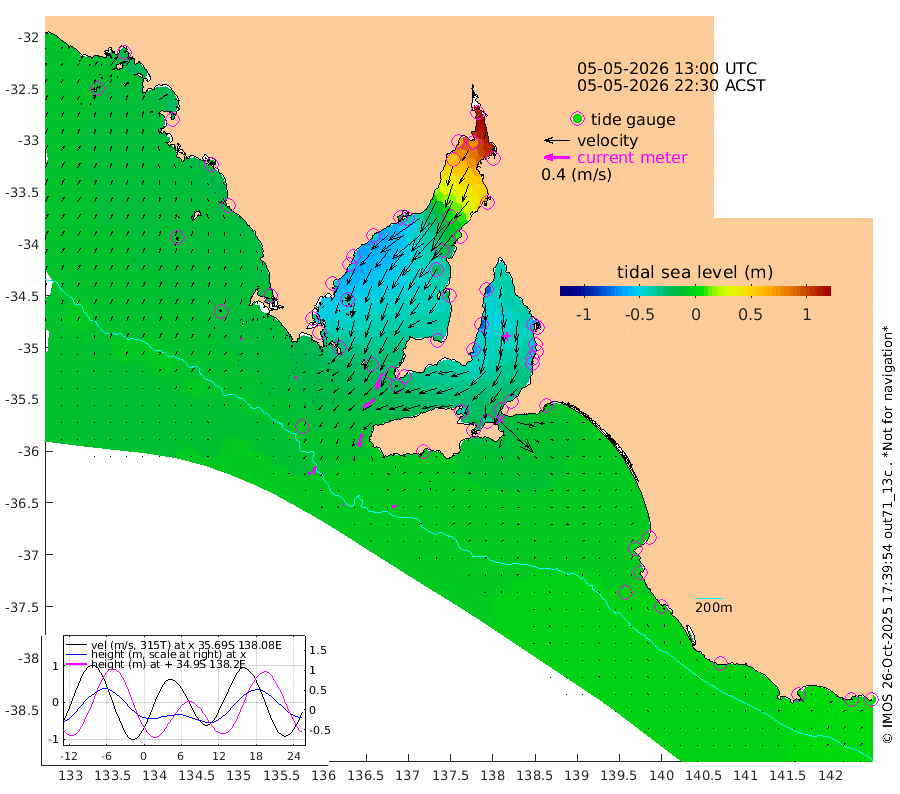 1cm/s -98T +10cm/s rms + 5cm/s 114T. SAM1DS 520m 4cm/s -165T +13cm/s rms + 5cm/s -36T. SAM2CP 100m 11cm/s -162T +21cm/s rms + 18cm/s 142T. SAM3MS 168m 8cm/s -106T +22cm/s rms + 0cm/s -30T. SAM4CY 117m 3cm/s 58T +23cm/s rms + 2cm/s 99T. SAM5CB 94m 20cm/s -128T +8cm/s rms + 3cm/s -172T. SAM6IS 83m 6cm/s -163T +11cm/s rms + 7cm/s 150T. SAM7DS 519m 26cm/s -158T +10cm/s rms + 2cm/s 87T. SAM8SG 47m 20cm/s -168T +20cm/s rms + 12cm/s -168T. NRSKAI 101m 4cm Warrnambool 3cm Port Fairy 2cm Portland 0cm Port Macdonnell -2cm Beachport -2cm Cape Rabelais (off) -1cm Robe 1cm Cape Jaffa 0cm Kingston -9cm Victor Harbor -8cm Vivonne Bay -39cm Kingscote -27cm American River -36cm Penneshaw -29cm Cape Jervis -34cm Second Valley -52cm Port Noarlunga -54cm Port Stanvac -54cm Brighton -57cm Glenelg -60cm Port Adelaide (Outer Harbor) -31cm Angus Inlet (Garden Island) -81cm Ardrossan -78cm Port Vincent -66cm Port Giles -26cm Stenhouse Bay -19cm Althorpe Island -15cm Pondalowie Bay -26cm Point Turton -24cm Port Victoria -23cm Cape Elizabeth -15cm Tiparra Reef Light 9cm Wallaroo 6cm Middle Bank 69cm Port Broughton 104cm Port Pirie 110cm Red Cliff Point (Beacon 5) 75cm Port Bonython 70cm Whyalla 58cm Western Shoal Beacon -6cm Franklin Harbor -39cm Franklin Harbor Entrance Beacon -45cm Arno Bay -55cm Port Neill -48cm Cape Hardy -47cm Tumby Bay -39cm Reevesby Island -40cm Port Lincoln -28cm Taylors Landing -27cm Whalers Bay -21cm Wedge Island Mooring -7cm Shelf Edge Mooring -11cm Coffin Bay Entrance Beacon -8cm Greenly Island -10cm Elliston -11cm Pearson Island -8cm Venus Bay -17cm Blanche Port (Streaky Bay) -17cm Thevenard -14cm St Francis Island