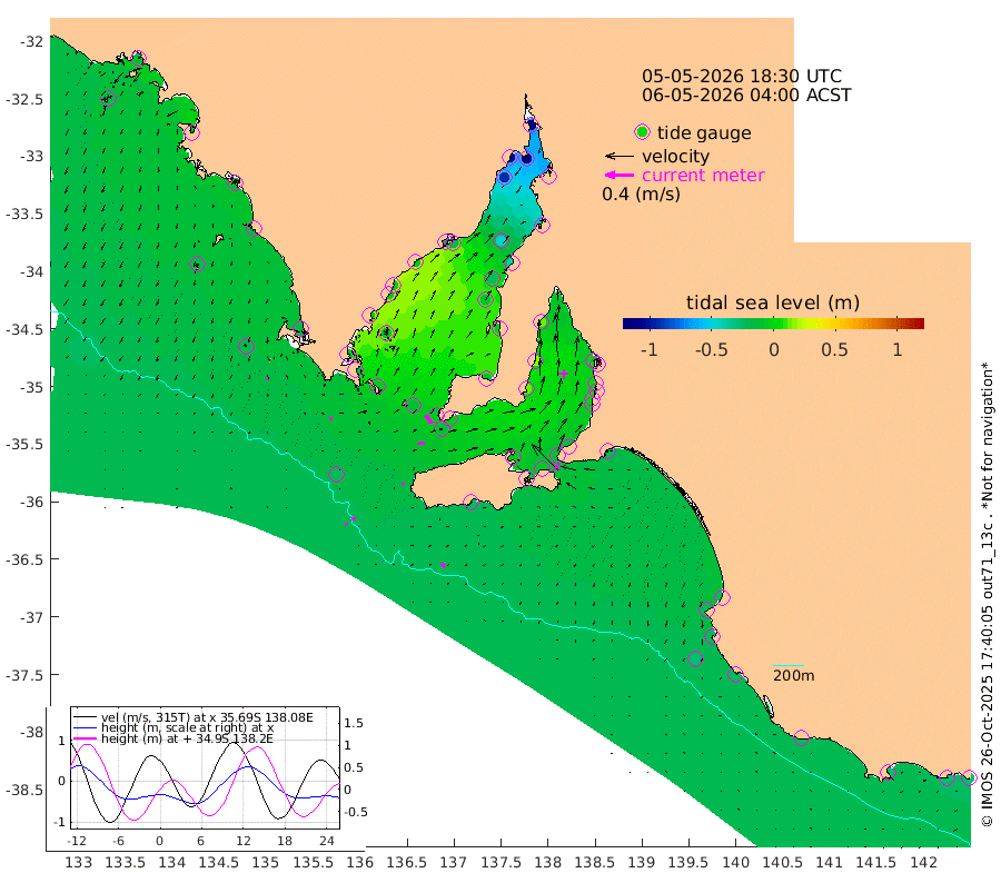 0cm/s 42T +10cm/s rms + 5cm/s 114T. SAM1DS 520m 3cm/s 103T +13cm/s rms + 5cm/s -36T. SAM2CP 100m 7cm/s 97T +21cm/s rms + 18cm/s 142T. SAM3MS 168m 8cm/s 151T +22cm/s rms + 0cm/s -30T. SAM4CY 117m 3cm/s 178T +23cm/s rms + 2cm/s 99T. SAM5CB 94m 10cm/s 81T +8cm/s rms + 3cm/s -172T. SAM6IS 83m 3cm/s 99T +11cm/s rms + 7cm/s 150T. SAM7DS 519m 14cm/s 143T +10cm/s rms + 2cm/s 87T. SAM8SG 47m 3cm/s 154T +20cm/s rms + 12cm/s -168T. NRSKAI 101m -29cm Warrnambool -28cm Port Fairy -27cm Portland -24cm Port Macdonnell -26cm Beachport -26cm Cape Rabelais (off) -23cm Robe -24cm Cape Jaffa -24cm Kingston -25cm Victor Harbor -24cm Vivonne Bay -6cm Kingscote -12cm American River -7cm Penneshaw -11cm Cape Jervis -11cm Second Valley -1cm Port Noarlunga 0cm Port Stanvac 1cm Brighton 4cm Glenelg 3cm Port Adelaide (Outer Harbor) -21cm Angus Inlet (Garden Island) 13cm Ardrossan 17cm Port Vincent 11cm Port Giles -5cm Stenhouse Bay -13cm Althorpe Island -11cm Pondalowie Bay -8cm Point Turton -5cm Port Victoria -12cm Cape Elizabeth -24cm Tiparra Reef Light -43cm Wallaroo -48cm Middle Bank -40cm Port Broughton -122cm Port Pirie -135cm Red Cliff Point (Beacon 5) -113cm Port Bonython -106cm Whyalla -93cm Western Shoal Beacon -25cm Franklin Harbor -15cm Franklin Harbor Entrance Beacon -8cm Arno Bay -5cm Port Neill -7cm Cape Hardy -6cm Tumby Bay -10cm Reevesby Island -5cm Port Lincoln -11cm Taylors Landing -6cm Whalers Bay -14cm Wedge Island Mooring -25cm Shelf Edge Mooring -20cm Coffin Bay Entrance Beacon -21cm Greenly Island -18cm Elliston -19cm Pearson Island -11cm Venus Bay -11cm Blanche Port (Streaky Bay) -11cm Thevenard -15cm St Francis Island