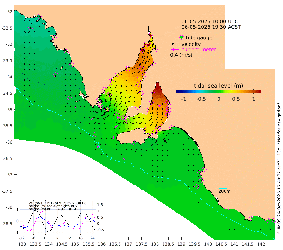 1cm/s -115T +10cm/s rms + 5cm/s 114T. SAM1DS 520m 12cm/s -119T +13cm/s rms + 5cm/s -36T. SAM2CP 100m 10cm/s -99T +21cm/s rms + 18cm/s 142T. SAM3MS 168m 10cm/s -78T +22cm/s rms + 0cm/s -30T. SAM4CY 117m 4cm/s -160T +23cm/s rms + 2cm/s 99T. SAM5CB 94m 15cm/s -119T +8cm/s rms + 3cm/s -172T. SAM6IS 83m 4cm/s -101T +11cm/s rms + 7cm/s 150T. SAM7DS 519m 17cm/s -102T +10cm/s rms + 2cm/s 87T. SAM8SG 47m 9cm/s -154T +20cm/s rms + 12cm/s -168T. NRSKAI 101m 2cm Warrnambool 3cm Port Fairy 2cm Portland 6cm Port Macdonnell 1cm Beachport 1cm Cape Rabelais (off) 0cm Robe 3cm Cape Jaffa 2cm Kingston 4cm Victor Harbor -7cm Vivonne Bay 59cm Kingscote 58cm American River 42cm Penneshaw 51cm Cape Jervis 76cm Second Valley 89cm Port Noarlunga 92cm Port Stanvac 94cm Brighton 95cm Glenelg 107cm Port Adelaide (Outer Harbor) 120cm Angus Inlet (Garden Island) 123cm Ardrossan 103cm Port Vincent 81cm Port Giles 13cm Stenhouse Bay 18cm Althorpe Island 13cm Pondalowie Bay 37cm Point Turton 38cm Port Victoria 51cm Cape Elizabeth 56cm Tiparra Reef Light 78cm Wallaroo 87cm Middle Bank 56cm Port Broughton 125cm Port Pirie 140cm Red Cliff Point (Beacon 5) 127cm Port Bonython 129cm Whyalla 119cm Western Shoal Beacon 81cm Franklin Harbor 60cm Franklin Harbor Entrance Beacon 41cm Arno Bay 36cm Port Neill 29cm Cape Hardy 21cm Tumby Bay 20cm Reevesby Island 8cm Port Lincoln 1cm Taylors Landing 25cm Whalers Bay 11cm Wedge Island Mooring 0cm Shelf Edge Mooring -6cm Coffin Bay Entrance Beacon -8cm Greenly Island -11cm Elliston -12cm Pearson Island -2cm Venus Bay -22cm Blanche Port (Streaky Bay) -26cm Thevenard -24cm St Francis Island