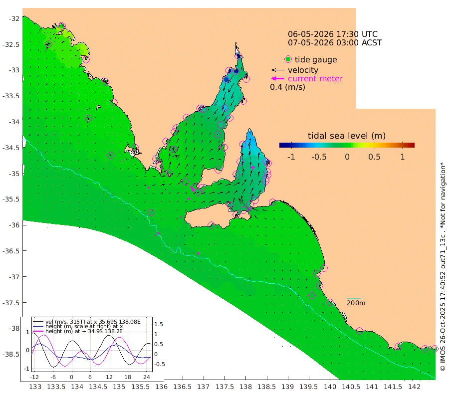 1cm/s -38T +10cm/s rms + 5cm/s 114T. SAM1DS 520m 5cm/s 89T +13cm/s rms + 5cm/s -36T. SAM2CP 100m 8cm/s 122T +21cm/s rms + 18cm/s 142T. SAM3MS 168m 7cm/s 171T +22cm/s rms + 0cm/s -30T. SAM4CY 117m 1cm/s 139T +23cm/s rms + 2cm/s 99T. SAM5CB 94m 10cm/s 83T +8cm/s rms + 3cm/s -172T. SAM6IS 83m 4cm/s 125T +11cm/s rms + 7cm/s 150T. SAM7DS 519m 18cm/s 151T +10cm/s rms + 2cm/s 87T. SAM8SG 47m 5cm/s 163T +20cm/s rms + 12cm/s -168T. NRSKAI 101m -11cm Warrnambool -12cm Port Fairy -11cm Portland -10cm Port Macdonnell -12cm Beachport -12cm Cape Rabelais (off) -8cm Robe -8cm Cape Jaffa -8cm Kingston -14cm Victor Harbor -12cm Vivonne Bay -30cm Kingscote -31cm American River -24cm Penneshaw -30cm Cape Jervis -41cm Second Valley -44cm Port Noarlunga -44cm Port Stanvac -45cm Brighton -43cm Glenelg -50cm Port Adelaide (Outer Harbor) -67cm Angus Inlet (Garden Island) -56cm Ardrossan -40cm Port Vincent -33cm Port Giles -6cm Stenhouse Bay -12cm Althorpe Island -7cm Pondalowie Bay -12cm Point Turton -11cm Port Victoria -20cm Cape Elizabeth -29cm Tiparra Reef Light -45cm Wallaroo -54cm Middle Bank -16cm Port Broughton -98cm Port Pirie -114cm Red Cliff Point (Beacon 5) -100cm Port Bonython -98cm Whyalla -88cm Western Shoal Beacon -34cm Franklin Harbor -30cm Franklin Harbor Entrance Beacon -21cm Arno Bay -17cm Port Neill -19cm Cape Hardy -15cm Tumby Bay -15cm Reevesby Island -7cm Port Lincoln -7cm Taylors Landing -10cm Whalers Bay -10cm Wedge Island Mooring -13cm Shelf Edge Mooring -6cm Coffin Bay Entrance Beacon -9cm Greenly Island -3cm Elliston -7cm Pearson Island -1cm Venus Bay 8cm Blanche Port (Streaky Bay) 7cm Thevenard -2cm St Francis Island