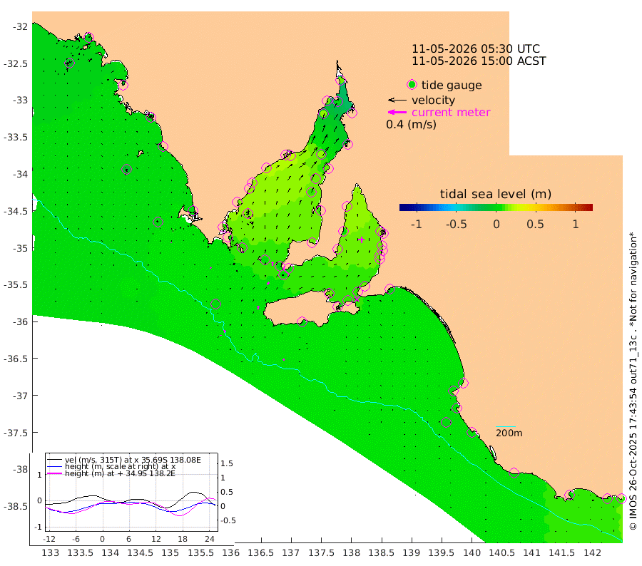 0cm/s 98T +10cm/s rms + 5cm/s 114T. SAM1DS 520m 2cm/s -64T +13cm/s rms + 5cm/s -36T. SAM2CP 100m 5cm/s -19T +21cm/s rms + 18cm/s 142T. SAM3MS 168m 4cm/s 25T +22cm/s rms + 0cm/s -30T. SAM4CY 117m 1cm/s -169T +23cm/s rms + 2cm/s 99T. SAM5CB 94m 6cm/s 39T +8cm/s rms + 3cm/s -172T. SAM6IS 83m 2cm/s -11T +11cm/s rms + 7cm/s 150T. SAM7DS 519m 9cm/s -1T +10cm/s rms + 2cm/s 87T. SAM8SG 47m 6cm/s 4T +20cm/s rms + 12cm/s -168T. NRSKAI 101m 10cm Warrnambool 8cm Port Fairy 7cm Portland 3cm Port Macdonnell 4cm Beachport 3cm Cape Rabelais (off) 4cm Robe 5cm Cape Jaffa 4cm Kingston 6cm Victor Harbor 3cm Vivonne Bay 12cm Kingscote 6cm American River 10cm Penneshaw 9cm Cape Jervis 13cm Second Valley 14cm Port Noarlunga 15cm Port Stanvac 14cm Brighton 14cm Glenelg 16cm Port Adelaide (Outer Harbor) 11cm Angus Inlet (Garden Island) 18cm Ardrossan 6cm Port Vincent 15cm Port Giles 4cm Stenhouse Bay 6cm Althorpe Island 2cm Pondalowie Bay 11cm Point Turton 8cm Port Victoria 11cm Cape Elizabeth 13cm Tiparra Reef Light 13cm Wallaroo 16cm Middle Bank -15cm Port Broughton 5cm Port Pirie 12cm Red Cliff Point (Beacon 5) 2cm Port Bonython 13cm Whyalla 17cm Western Shoal Beacon 18cm Franklin Harbor 23cm Franklin Harbor Entrance Beacon 17cm Arno Bay 15cm Port Neill 16cm Cape Hardy 15cm Tumby Bay 11cm Reevesby Island 10cm Port Lincoln 5cm Taylors Landing 8cm Whalers Bay 5cm Wedge Island Mooring 2cm Shelf Edge Mooring 1cm Coffin Bay Entrance Beacon 1cm Greenly Island 1cm Elliston -8cm Pearson Island -1cm Venus Bay -4cm Blanche Port (Streaky Bay) -4cm Thevenard -7cm St Francis Island