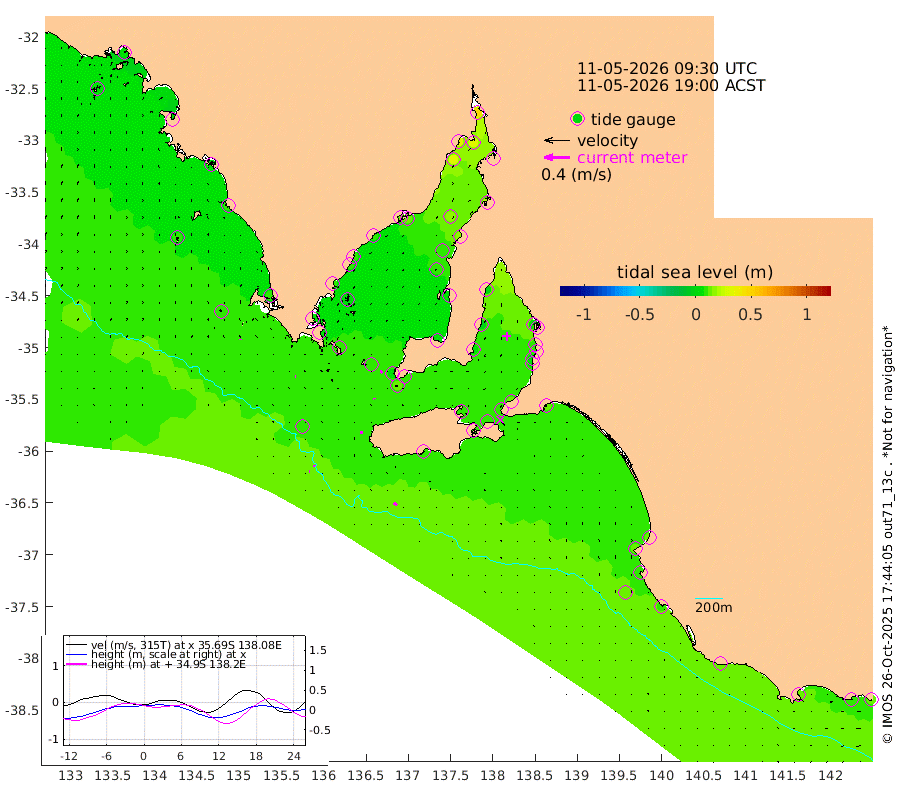 1cm/s -64T +10cm/s rms + 5cm/s 114T. SAM1DS 520m 1cm/s -93T +13cm/s rms + 5cm/s -36T. SAM2CP 100m 3cm/s -73T +21cm/s rms + 18cm/s 142T. SAM3MS 168m 6cm/s -49T +22cm/s rms + 0cm/s -30T. SAM4CY 117m 1cm/s 2T +23cm/s rms + 2cm/s 99T. SAM5CB 94m 2cm/s -13T +8cm/s rms + 3cm/s -172T. SAM6IS 83m 1cm/s -74T +11cm/s rms + 7cm/s 150T. SAM7DS 519m 5cm/s -27T +10cm/s rms + 2cm/s 87T. SAM8SG 47m 3cm/s -4T +20cm/s rms + 12cm/s -168T. NRSKAI 101m 11cm Warrnambool 11cm Port Fairy 11cm Portland 13cm Port Macdonnell 11cm Beachport 12cm Cape Rabelais (off) 10cm Robe 14cm Cape Jaffa 13cm Kingston 12cm Victor Harbor 10cm Vivonne Bay 8cm Kingscote 9cm American River 10cm Penneshaw 9cm Cape Jervis 14cm Second Valley 6cm Port Noarlunga 6cm Port Stanvac 8cm Brighton 8cm Glenelg 6cm Port Adelaide (Outer Harbor) 10cm Angus Inlet (Garden Island) 3cm Ardrossan -1cm Port Vincent 5cm Port Giles 8cm Stenhouse Bay 12cm Althorpe Island 7cm Pondalowie Bay 6cm Point Turton 6cm Port Victoria 8cm Cape Elizabeth 11cm Tiparra Reef Light 17cm Wallaroo 19cm Middle Bank 22cm Port Broughton 40cm Port Pirie 48cm Red Cliff Point (Beacon 5) 32cm Port Bonython 35cm Whyalla 33cm Western Shoal Beacon 13cm Franklin Harbor 11cm Franklin Harbor Entrance Beacon 8cm Arno Bay 9cm Port Neill 8cm Cape Hardy 9cm Tumby Bay 2cm Reevesby Island 6cm Port Lincoln 7cm Taylors Landing 8cm Whalers Bay 9cm Wedge Island Mooring 11cm Shelf Edge Mooring 8cm Coffin Bay Entrance Beacon 9cm Greenly Island 11cm Elliston 9cm Pearson Island 6cm Venus Bay 5cm Blanche Port (Streaky Bay) 4cm Thevenard 6cm St Francis Island