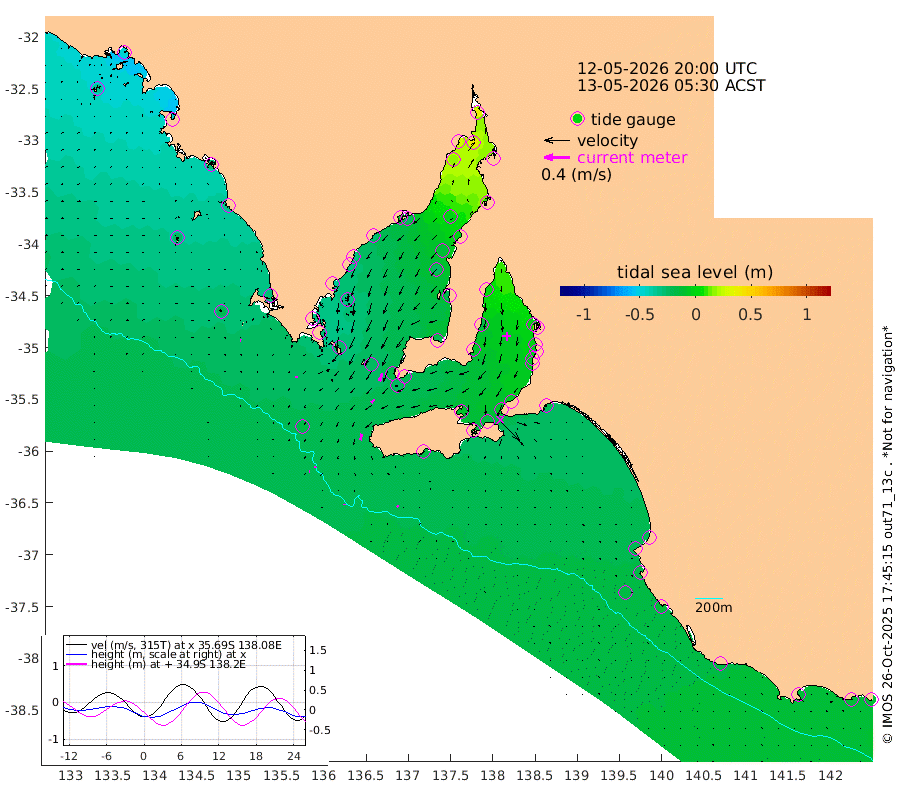 0cm/s 0T +10cm/s rms + 5cm/s 114T. SAM1DS 520m 2cm/s -177T +13cm/s rms + 5cm/s -36T. SAM2CP 100m 3cm/s -163T +21cm/s rms + 18cm/s 142T. SAM3MS 168m 3cm/s 138T +22cm/s rms + 0cm/s -30T. SAM4CY 117m 1cm/s 110T +23cm/s rms + 2cm/s 99T. SAM5CB 94m 7cm/s -136T +8cm/s rms + 3cm/s -172T. SAM6IS 83m 1cm/s -116T +11cm/s rms + 7cm/s 150T. SAM7DS 519m 12cm/s -161T +10cm/s rms + 2cm/s 87T. SAM8SG 47m 10cm/s -168T +20cm/s rms + 12cm/s -168T. NRSKAI 101m -11cm Warrnambool -12cm Port Fairy -13cm Portland -16cm Port Macdonnell -14cm Beachport -15cm Cape Rabelais (off) -16cm Robe -21cm Cape Jaffa -20cm Kingston -20cm Victor Harbor -17cm Vivonne Bay -11cm Kingscote -11cm American River -16cm Penneshaw -9cm Cape Jervis -7cm Second Valley -4cm Port Noarlunga -4cm Port Stanvac -4cm Brighton -3cm Glenelg -1cm Port Adelaide (Outer Harbor) 18cm Angus Inlet (Garden Island) 2cm Ardrossan -18cm Port Vincent -11cm Port Giles -20cm Stenhouse Bay -23cm Althorpe Island -19cm Pondalowie Bay -22cm Point Turton -21cm Port Victoria -23cm Cape Elizabeth -14cm Tiparra Reef Light -3cm Wallaroo -1cm Middle Bank 8cm Port Broughton 35cm Port Pirie 34cm Red Cliff Point (Beacon 5) 38cm Port Bonython 29cm Whyalla 18cm Western Shoal Beacon -11cm Franklin Harbor -24cm Franklin Harbor Entrance Beacon -27cm Arno Bay -32cm Port Neill -32cm Cape Hardy -35cm Tumby Bay -31cm Reevesby Island -32cm Port Lincoln -28cm Taylors Landing -24cm Whalers Bay -24cm Wedge Island Mooring -19cm Shelf Edge Mooring -30cm Coffin Bay Entrance Beacon -22cm Greenly Island -32cm Elliston -25cm Pearson Island -26cm Venus Bay -47cm Blanche Port (Streaky Bay) -45cm Thevenard -36cm St Francis Island