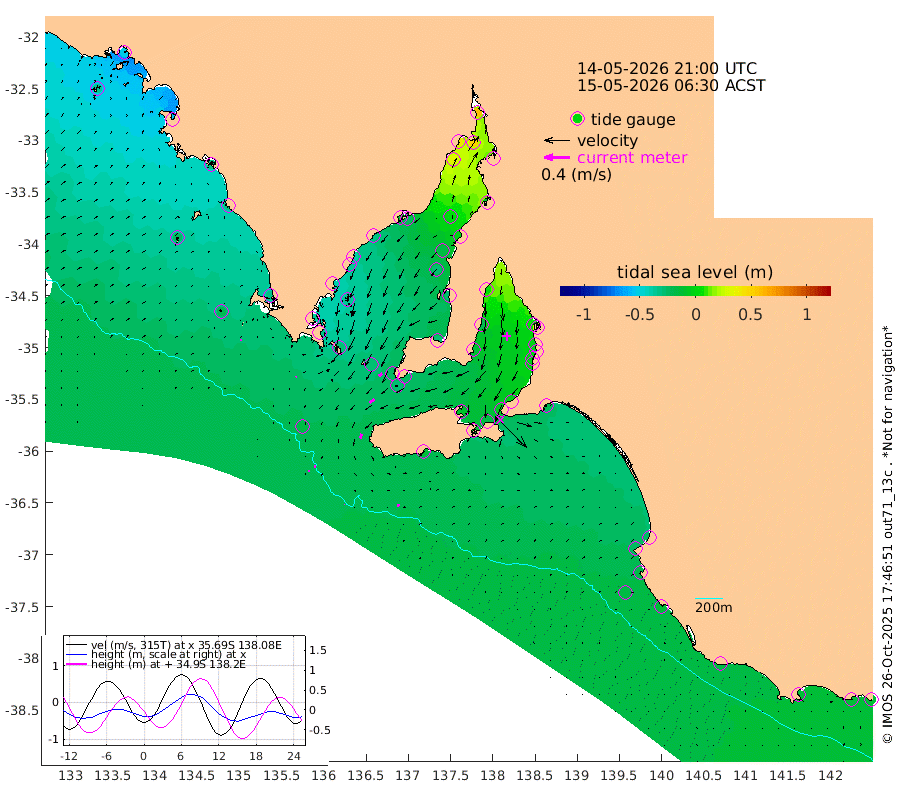 1cm/s 65T +10cm/s rms + 5cm/s 114T. SAM1DS 520m 1cm/s -160T +13cm/s rms + 5cm/s -36T. SAM2CP 100m 2cm/s -87T +21cm/s rms + 18cm/s 142T. SAM3MS 168m 4cm/s 76T +22cm/s rms + 0cm/s -30T. SAM4CY 117m 2cm/s 78T +23cm/s rms + 2cm/s 99T. SAM5CB 94m 9cm/s -124T +8cm/s rms + 3cm/s -172T. SAM6IS 83m 2cm/s -63T +11cm/s rms + 7cm/s 150T. SAM7DS 519m 6cm/s -127T +10cm/s rms + 2cm/s 87T. SAM8SG 47m 7cm/s -162T +20cm/s rms + 12cm/s -168T. NRSKAI 101m -12cm Warrnambool -12cm Port Fairy -13cm Portland -17cm Port Macdonnell -14cm Beachport -16cm Cape Rabelais (off) -17cm Robe -23cm Cape Jaffa -23cm Kingston -20cm Victor Harbor -14cm Vivonne Bay -11cm Kingscote -10cm American River -15cm Penneshaw -6cm Cape Jervis -2cm Second Valley -1cm Port Noarlunga -1cm Port Stanvac 0cm Brighton -1cm Glenelg 4cm Port Adelaide (Outer Harbor) 28cm Angus Inlet (Garden Island) 7cm Ardrossan -20cm Port Vincent -12cm Port Giles -24cm Stenhouse Bay -26cm Althorpe Island -24cm Pondalowie Bay -30cm Point Turton -27cm Port Victoria -28cm Cape Elizabeth -19cm Tiparra Reef Light -3cm Wallaroo 3cm Middle Bank -4cm Port Broughton 50cm Port Pirie 57cm Red Cliff Point (Beacon 5) 52cm Port Bonython 45cm Whyalla 31cm Western Shoal Beacon -14cm Franklin Harbor -26cm Franklin Harbor Entrance Beacon -30cm Arno Bay -39cm Port Neill -36cm Cape Hardy -38cm Tumby Bay -34cm Reevesby Island -36cm Port Lincoln -30cm Taylors Landing -29cm Whalers Bay -26cm Wedge Island Mooring -17cm Shelf Edge Mooring -33cm Coffin Bay Entrance Beacon -20cm Greenly Island -34cm Elliston -25cm Pearson Island -32cm Venus Bay -55cm Blanche Port (Streaky Bay) -52cm Thevenard -34cm St Francis Island