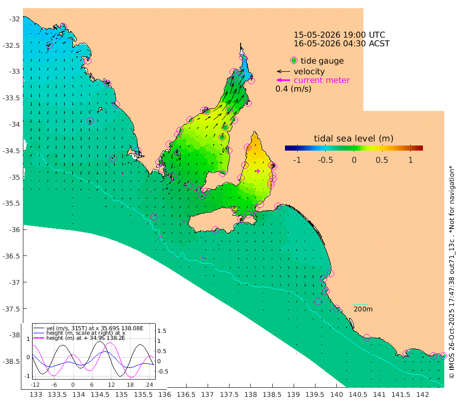 1cm/s 85T +10cm/s rms + 5cm/s 114T. SAM1DS 520m 3cm/s -142T +13cm/s rms + 5cm/s -36T. SAM2CP 100m 3cm/s 2T +21cm/s rms + 18cm/s 142T. SAM3MS 168m 7cm/s 105T +22cm/s rms + 0cm/s -30T. SAM4CY 117m 4cm/s 174T +23cm/s rms + 2cm/s 99T. SAM5CB 94m 1cm/s -138T +8cm/s rms + 3cm/s -172T. SAM6IS 83m 2cm/s 5T +11cm/s rms + 7cm/s 150T. SAM7DS 519m 1cm/s -168T +10cm/s rms + 2cm/s 87T. SAM8SG 47m 4cm/s -167T +20cm/s rms + 12cm/s -168T. NRSKAI 101m -36cm Warrnambool -33cm Port Fairy -34cm Portland -34cm Port Macdonnell -32cm Beachport -34cm Cape Rabelais (off) -34cm Robe -37cm Cape Jaffa -37cm Kingston -32cm Victor Harbor -31cm Vivonne Bay 16cm Kingscote 7cm American River 4cm Penneshaw 11cm Cape Jervis 22cm Second Valley 40cm Port Noarlunga 43cm Port Stanvac 45cm Brighton 48cm Glenelg 56cm Port Adelaide (Outer Harbor) 54cm Angus Inlet (Garden Island) 75cm Ardrossan 50cm Port Vincent 42cm Port Giles -15cm Stenhouse Bay -22cm Althorpe Island -20cm Pondalowie Bay -11cm Point Turton -4cm Port Victoria -5cm Cape Elizabeth -11cm Tiparra Reef Light -12cm Wallaroo -6cm Middle Bank -41cm Port Broughton -40cm Port Pirie -35cm Red Cliff Point (Beacon 5) -23cm Port Bonython -21cm Whyalla -21cm Western Shoal Beacon 0cm Franklin Harbor 2cm Franklin Harbor Entrance Beacon -1cm Arno Bay -6cm Port Neill -8cm Cape Hardy -12cm Tumby Bay -15cm Reevesby Island -18cm Port Lincoln -25cm Taylors Landing -12cm Whalers Bay -23cm Wedge Island Mooring -32cm Shelf Edge Mooring -38cm Coffin Bay Entrance Beacon -32cm Greenly Island -39cm Elliston -36cm Pearson Island -32cm Venus Bay -50cm Blanche Port (Streaky Bay) -49cm Thevenard -45cm St Francis Island
