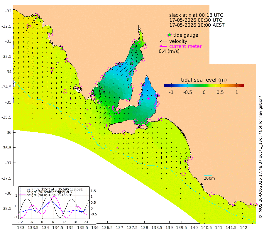 1cm/s 75T +10cm/s rms + 5cm/s 114T. SAM1DS 520m 9cm/s 42T +13cm/s rms + 5cm/s -36T. SAM2CP 100m 4cm/s 7T +21cm/s rms + 18cm/s 142T. SAM3MS 168m 8cm/s 33T +22cm/s rms + 0cm/s -30T. SAM4CY 117m 7cm/s 5T +23cm/s rms + 2cm/s 99T. SAM5CB 94m 6cm/s 23T +8cm/s rms + 3cm/s -172T. SAM6IS 83m 3cm/s -24T +11cm/s rms + 7cm/s 150T. SAM7DS 519m 22cm/s 17T +10cm/s rms + 2cm/s 87T. SAM8SG 47m 15cm/s 11T +20cm/s rms + 12cm/s -168T. NRSKAI 101m 32cm Warrnambool 31cm Port Fairy 32cm Portland 26cm Port Macdonnell 32cm Beachport 32cm Cape Rabelais (off) 29cm Robe 26cm Cape Jaffa 25cm Kingston 28cm Victor Harbor 37cm Vivonne Bay -29cm Kingscote -23cm American River -13cm Penneshaw -19cm Cape Jervis -36cm Second Valley -55cm Port Noarlunga -59cm Port Stanvac -60cm Brighton -66cm Glenelg -71cm Port Adelaide (Outer Harbor) -61cm Angus Inlet (Garden Island) -90cm Ardrossan -79cm Port Vincent -60cm Port Giles 4cm Stenhouse Bay 5cm Althorpe Island 6cm Pondalowie Bay -16cm Point Turton -19cm Port Victoria -22cm Cape Elizabeth -17cm Tiparra Reef Light -16cm Wallaroo -16cm Middle Bank -14cm Port Broughton 17cm Port Pirie 13cm Red Cliff Point (Beacon 5) 11cm Port Bonython 3cm Whyalla -4cm Western Shoal Beacon -35cm Franklin Harbor -24cm Franklin Harbor Entrance Beacon -16cm Arno Bay -18cm Port Neill -8cm Cape Hardy -3cm Tumby Bay 1cm Reevesby Island 8cm Port Lincoln 20cm Taylors Landing -7cm Whalers Bay 13cm Wedge Island Mooring 32cm Shelf Edge Mooring 28cm Coffin Bay Entrance Beacon 34cm Greenly Island 31cm Elliston 37cm Pearson Island 15cm Venus Bay 30cm Blanche Port (Streaky Bay) 34cm Thevenard 43cm St Francis Island