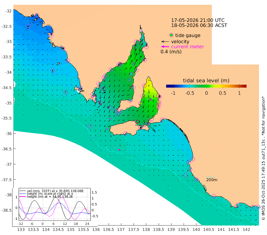 2cm/s 107T +10cm/s rms + 5cm/s 114T. SAM1DS 520m 2cm/s -147T +13cm/s rms + 5cm/s -36T. SAM2CP 100m 3cm/s 2T +21cm/s rms + 18cm/s 142T. SAM3MS 168m 11cm/s 91T +22cm/s rms + 0cm/s -30T. SAM4CY 117m 3cm/s 145T +23cm/s rms + 2cm/s 99T. SAM5CB 94m 9cm/s -120T +8cm/s rms + 3cm/s -172T. SAM6IS 83m 2cm/s -10T +11cm/s rms + 7cm/s 150T. SAM7DS 519m 2cm/s -157T +10cm/s rms + 2cm/s 87T. SAM8SG 47m 6cm/s -164T +20cm/s rms + 12cm/s -168T. NRSKAI 101m -45cm Warrnambool -42cm Port Fairy -43cm Portland -44cm Port Macdonnell -40cm Beachport -43cm Cape Rabelais (off) -45cm Robe -50cm Cape Jaffa -49cm Kingston -42cm Victor Harbor -36cm Vivonne Bay -7cm Kingscote -9cm American River -16cm Penneshaw -5cm Cape Jervis 6cm Second Valley 19cm Port Noarlunga 20cm Port Stanvac 23cm Brighton 23cm Glenelg 32cm Port Adelaide (Outer Harbor) 45cm Angus Inlet (Garden Island) 46cm Ardrossan 18cm Port Vincent 12cm Port Giles -35cm Stenhouse Bay -40cm Althorpe Island -38cm Pondalowie Bay -40cm Point Turton -34cm Port Victoria -33cm Cape Elizabeth -35cm Tiparra Reef Light -28cm Wallaroo -20cm Middle Bank -49cm Port Broughton -15cm Port Pirie 1cm Red Cliff Point (Beacon 5) -3cm Port Bonython -6cm Whyalla -11cm Western Shoal Beacon -20cm Franklin Harbor -26cm Franklin Harbor Entrance Beacon -31cm Arno Bay -40cm Port Neill -39cm Cape Hardy -42cm Tumby Bay -41cm Reevesby Island -45cm Port Lincoln -43cm Taylors Landing -38cm Whalers Bay -41cm Wedge Island Mooring -40cm Shelf Edge Mooring -52cm Coffin Bay Entrance Beacon -40cm Greenly Island -53cm Elliston -47cm Pearson Island -48cm Venus Bay -74cm Blanche Port (Streaky Bay) -69cm Thevenard -59cm St Francis Island